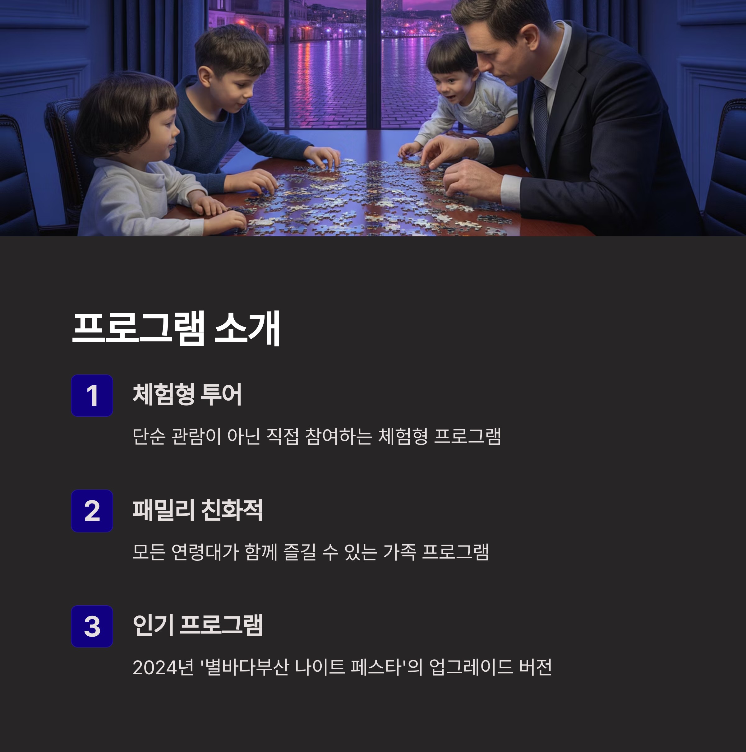 부산 원도심 나이트 미션투어 스파이 패밀리는 2025년 새롭게 선보이는 야간 체험 관광 프로그램입니다. 가족 모두가 탐정이 되어 부산 원도심의 밤을 누비며 미션을 수행하는 색다른 스토리 탐험 프로그램으로, 2024년 '별바다부산 나이트 페스타'에서 폭발적인 인기를 끌었던 프로그램의 업그레이드 버전입니다.