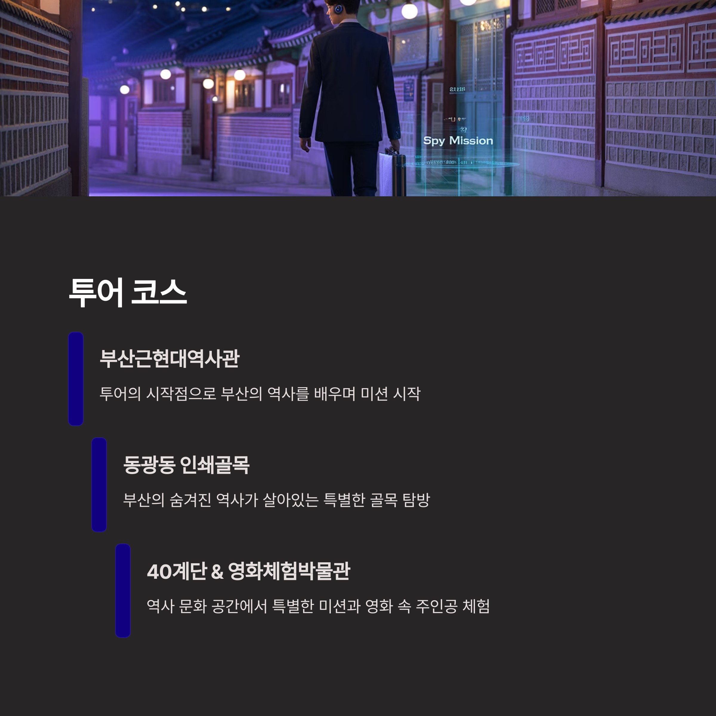 특히 이번 스파이 패밀리 테마의 미션투어는 참가자들이 가족 단위로 팀을 이루어 다양한 미션을 해결하며 부산 원도심의 숨겨진 이야기들을 발견해나가는 흥미진진한 프로그램입니다.
