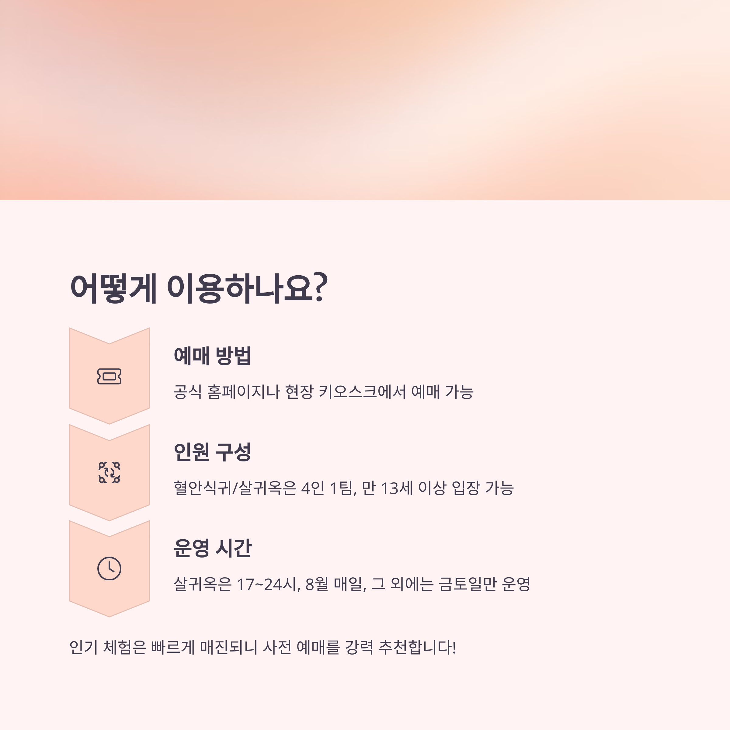 - 현장 키오스크 발권 가능 (단, 인기 시간대는 조기 마감되니 주의!)