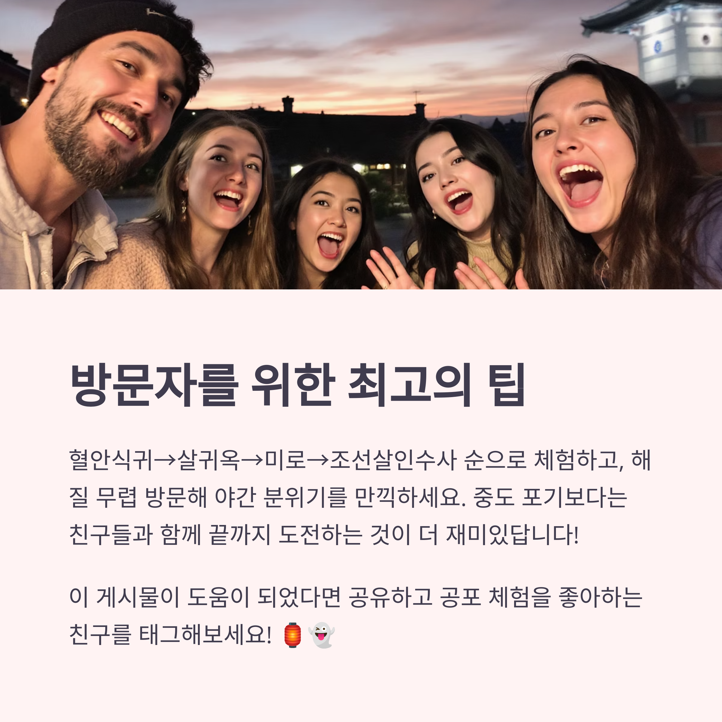- 팀 구성: 공포를 함께 나눌 친구들과 방문하면 더 재미있습니다