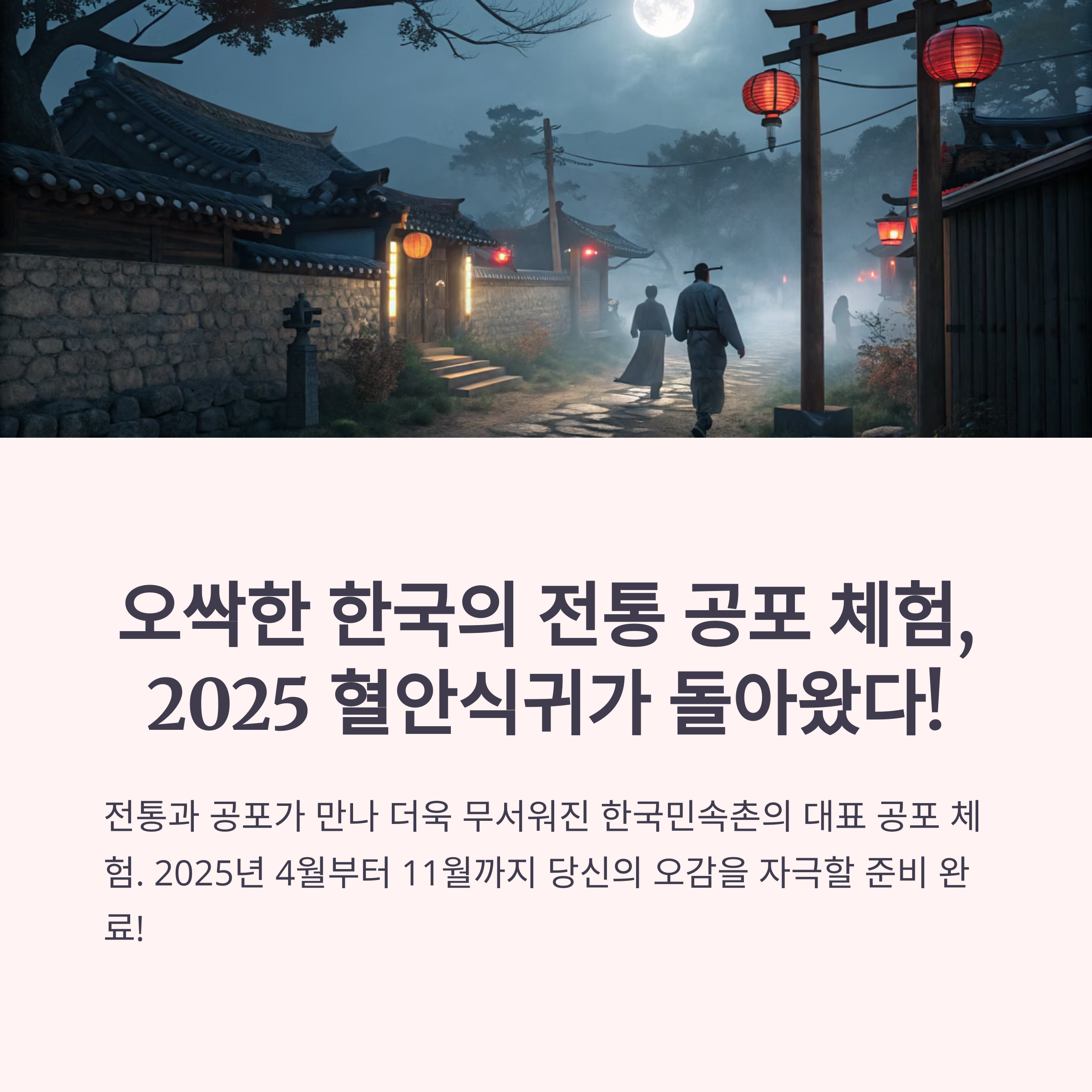 한국민속촌의 최고 인기 공포 체험 '혈안식귀'가 2025년에도 여러분을 기다립니다. 올해는 지난해보다 더 긴 기간 동안 운영되니 일정을 미리 확인하세요!