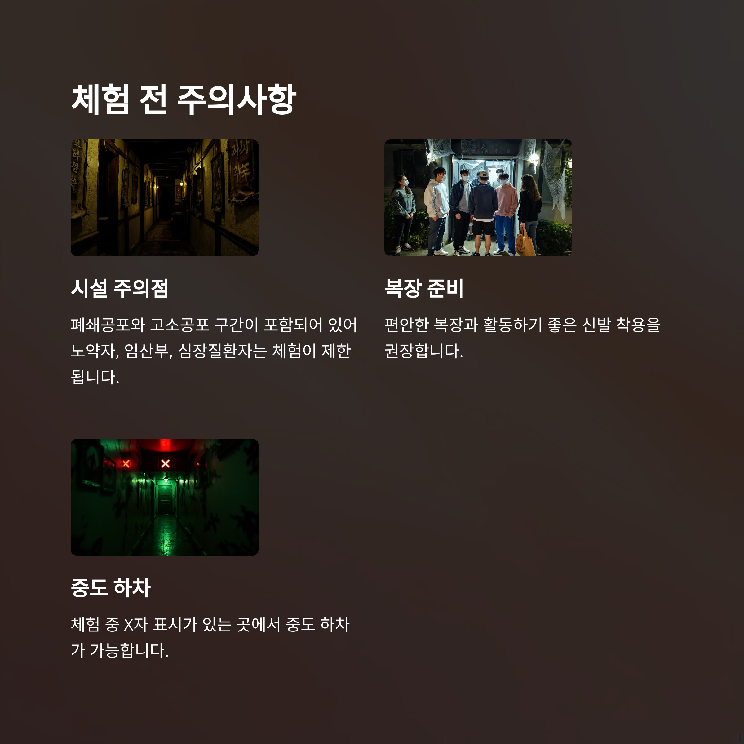 - 어린이, 임산부, 심장질환자, 심약자 등은 체험을 자제하는 것이 좋습니다