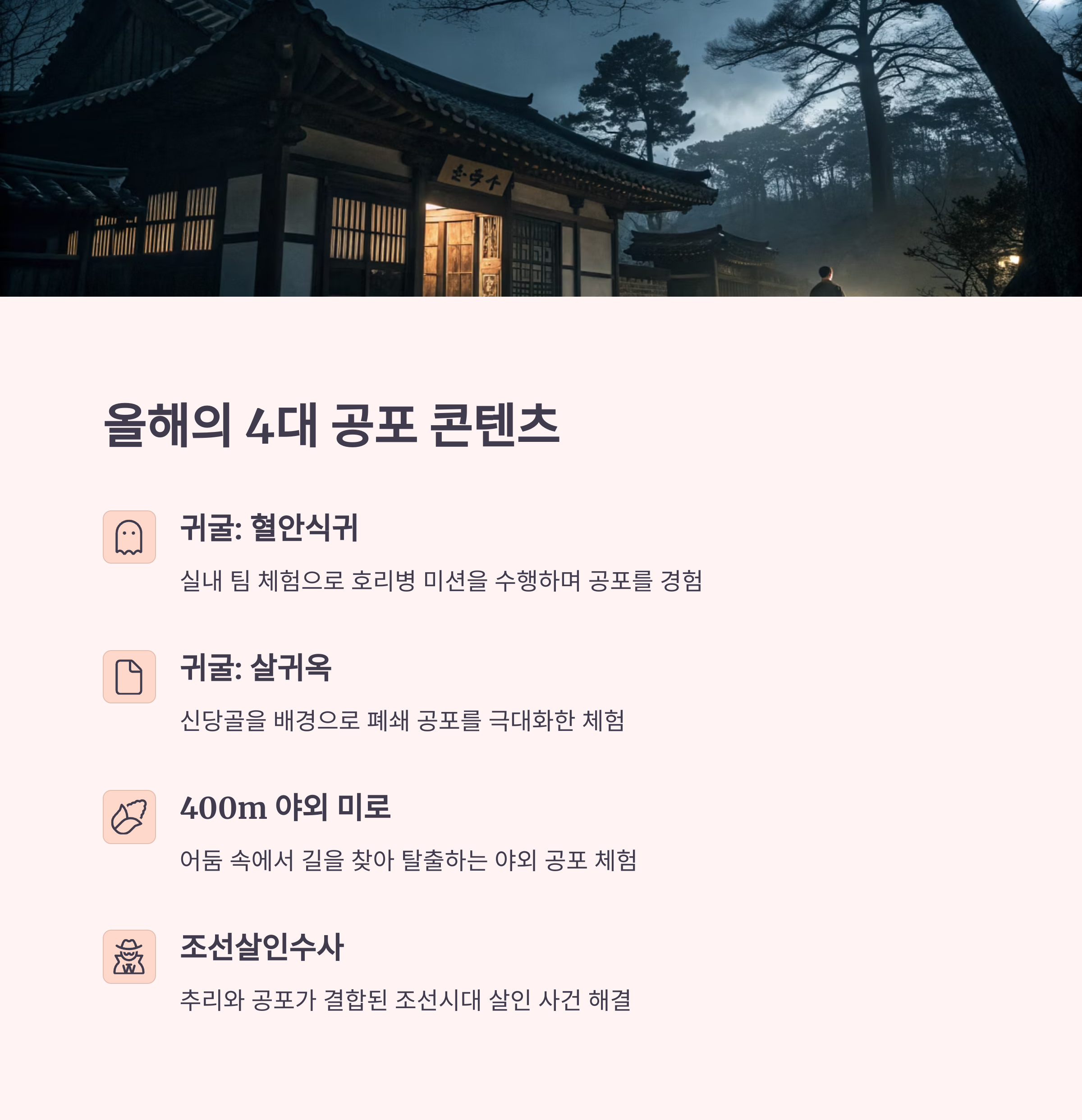 2025년에는 혈안식귀를 포함해 총 4가지 공포 콘텐츠가 준비되어 있습니다. 각각의 특징과 체험료, 소요시간 등을 확인하고 나에게 맞는 공포 체험을 선택해보세요!