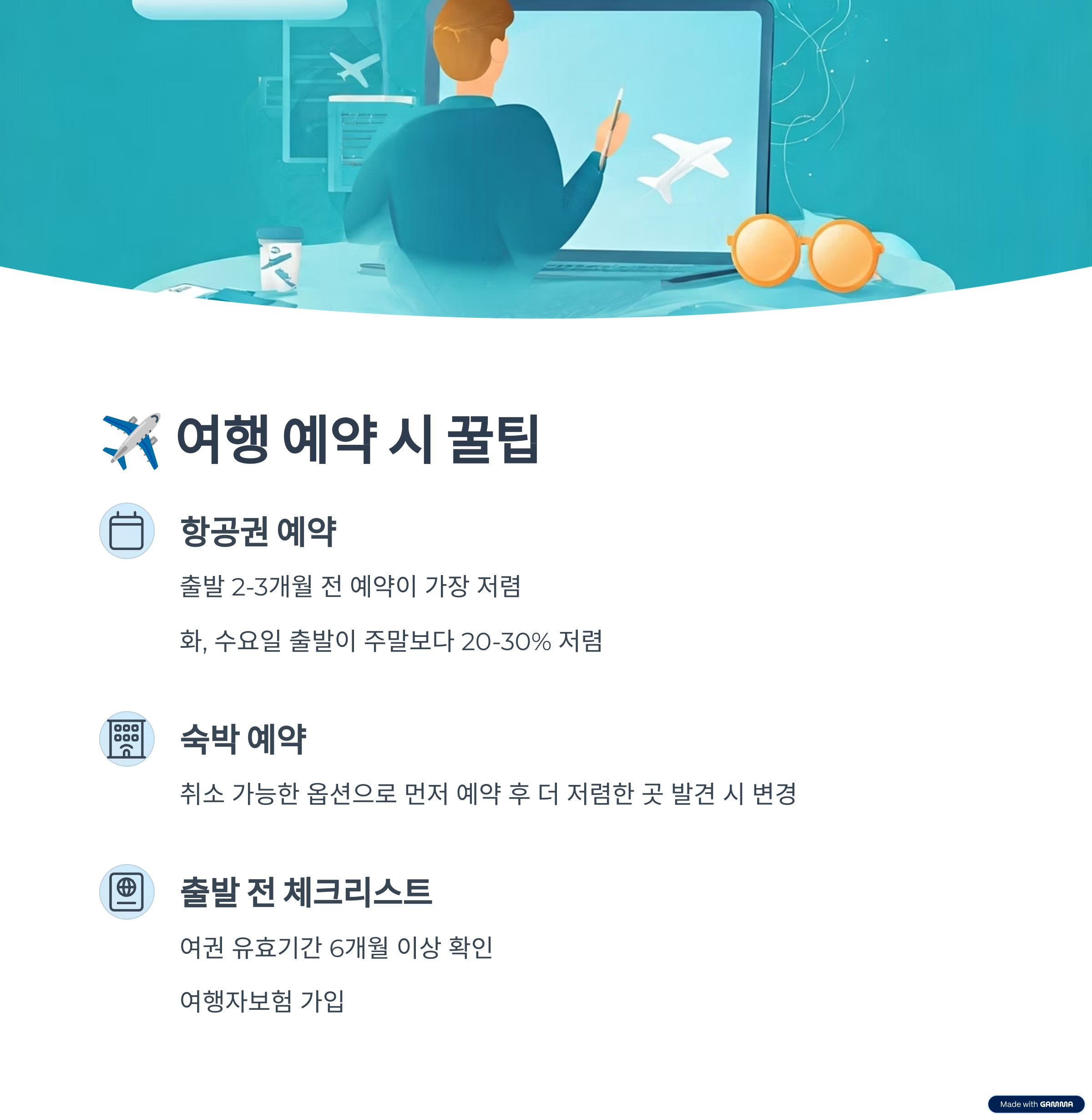 완벽한 여행은 철저한 준비에서 시작됩니다. 위에서 소개한 나라별 피해야 할 시기를 꼭 참고하여 최고의 여행 추억을 만들어보세요. 특히 동남아시아의 우기철과 일본의 장마철, 유럽의 성수기는 반드시 피하는 것이 좋습니다. 스마트한 여행객이 되어 시간과 비용을 모두 절약하는 완벽한 여행을 즐기시기 바랍니다.