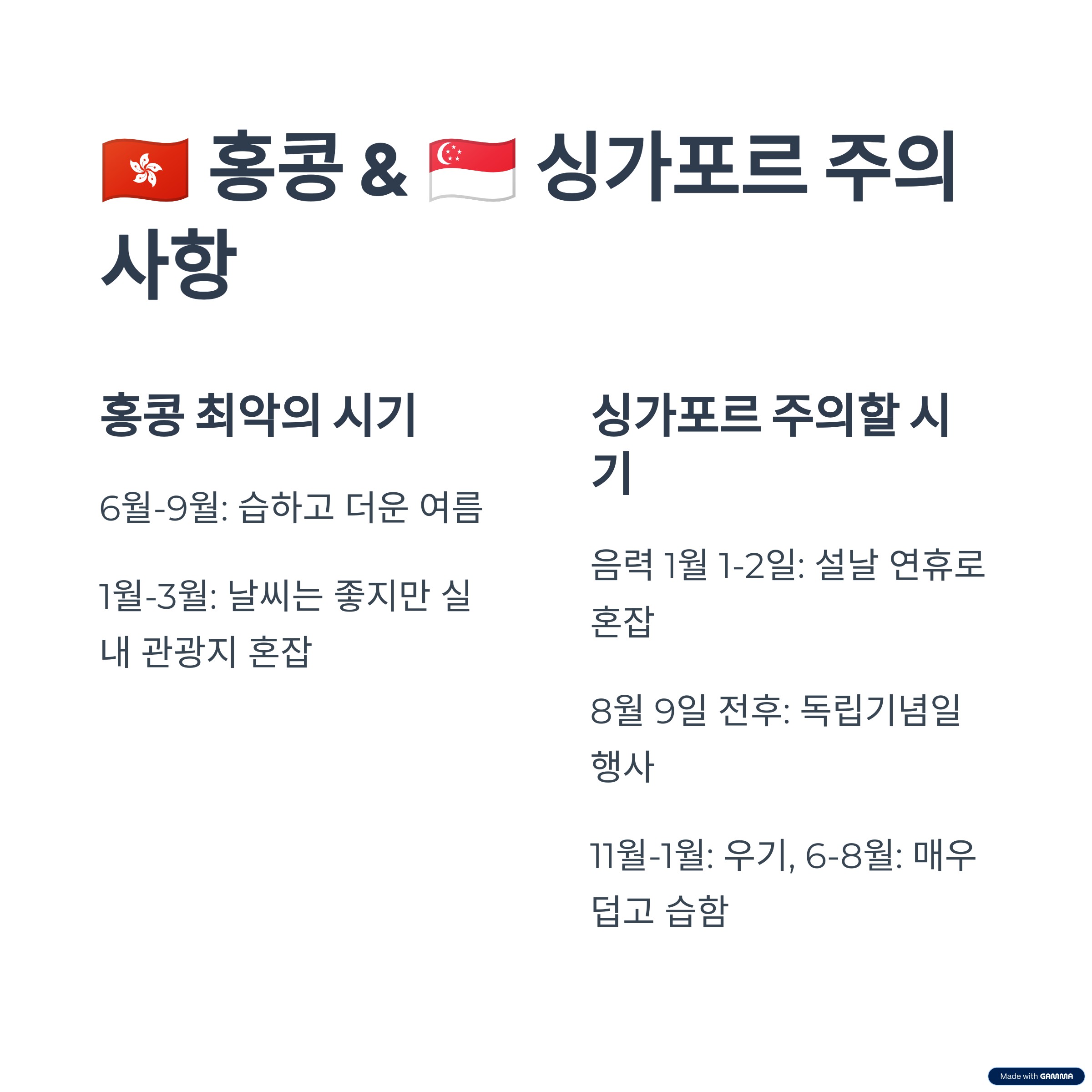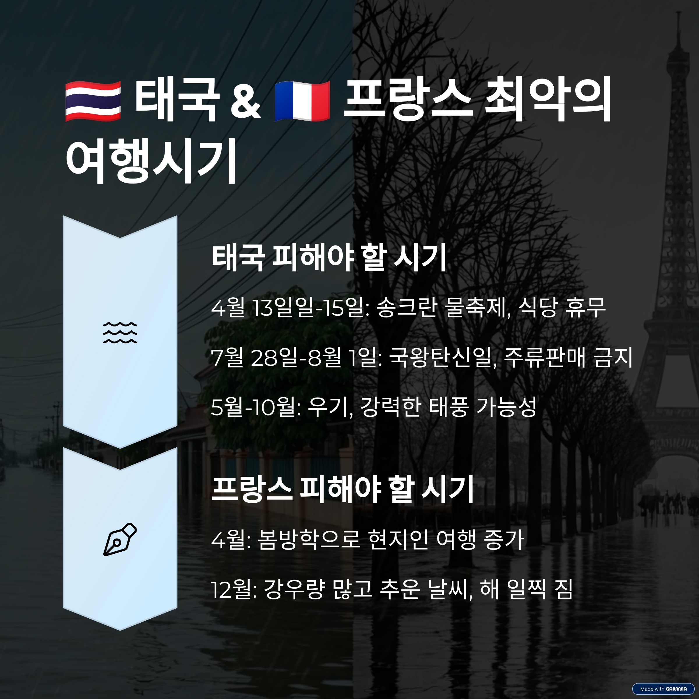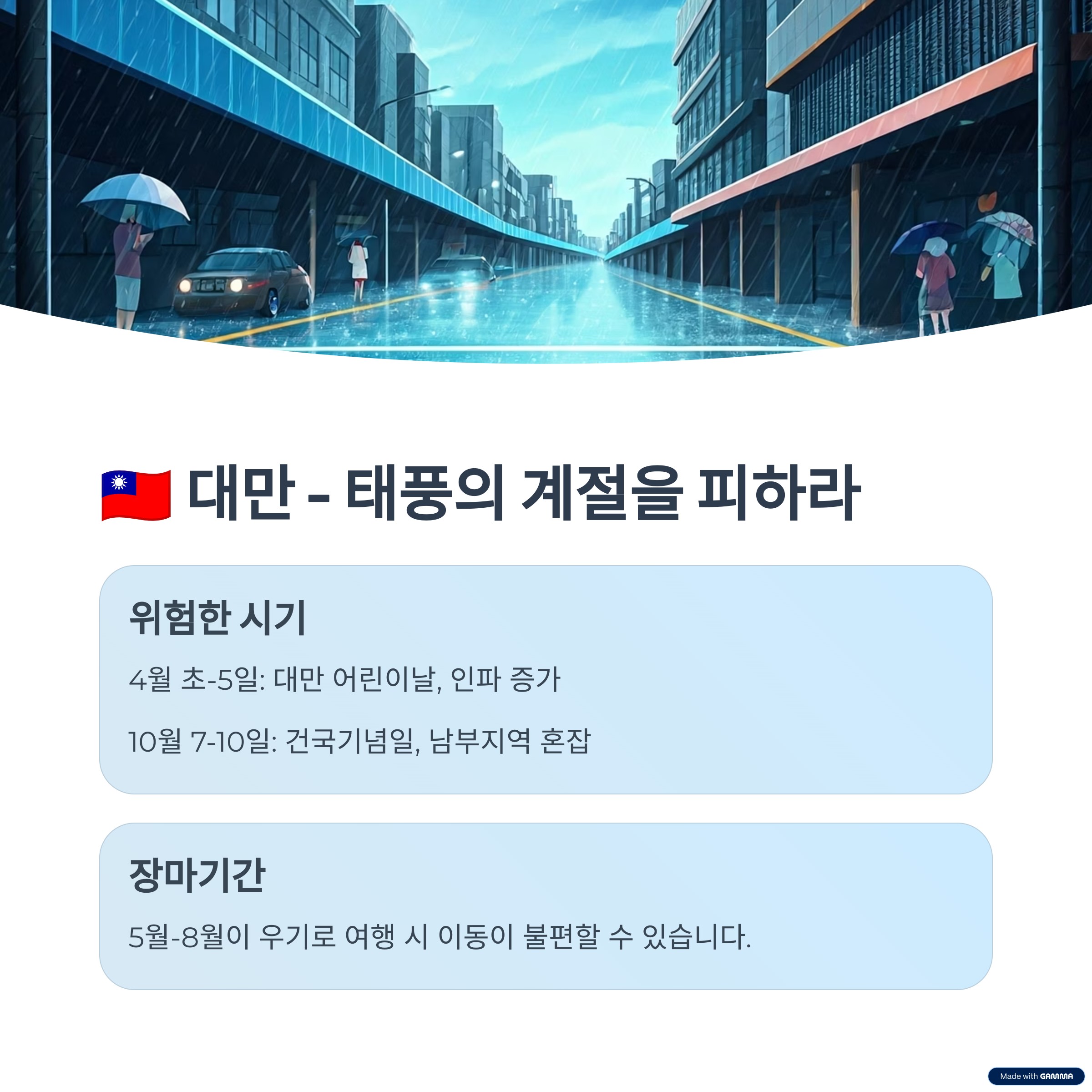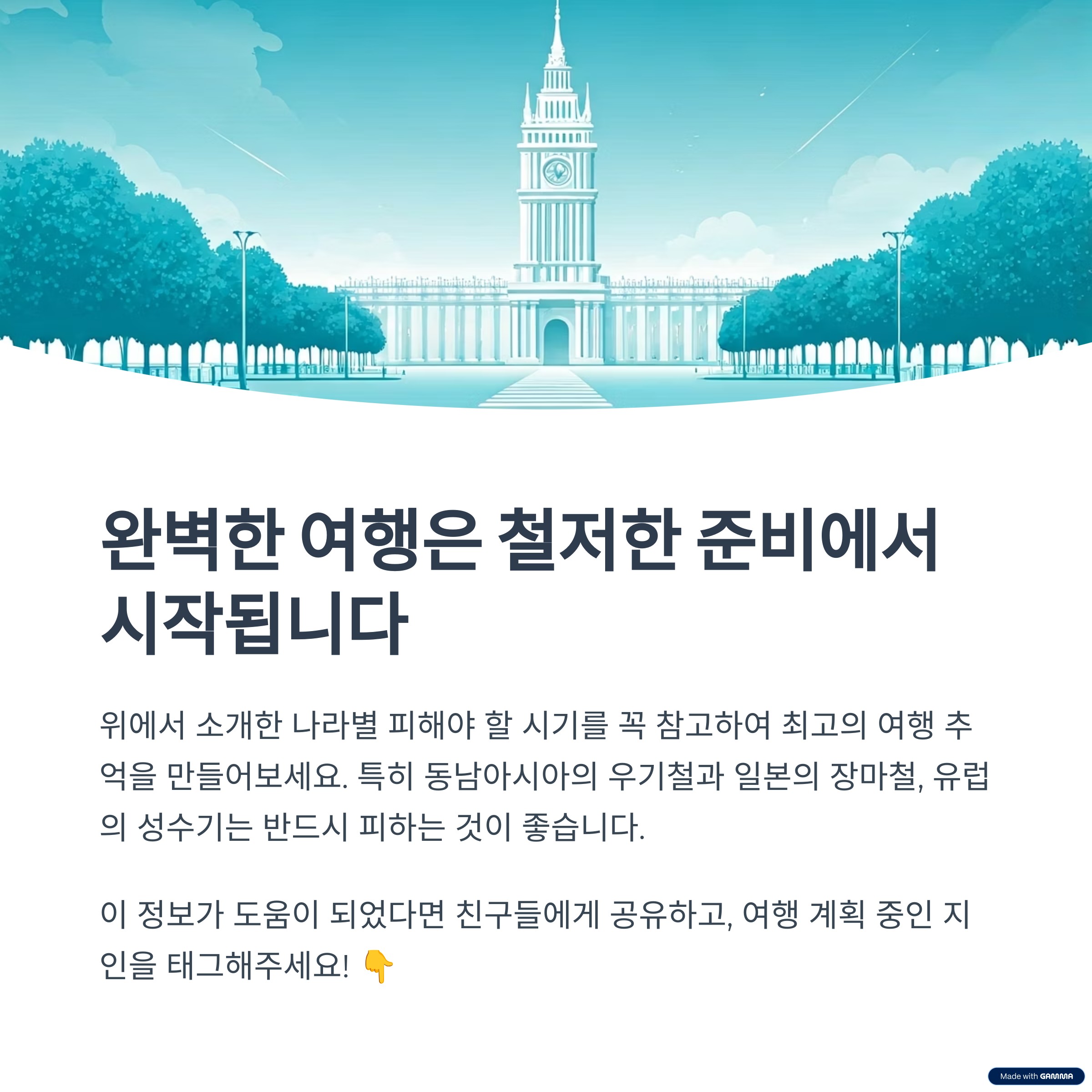 ⚠️ 여행 전 필독! 잘못된 시기에 떠난 여행으로 수백만원을 날리지 마세요. 각 나라별 피해야 할 시기를 미리 확인하고 완벽한 여행을 계획하세요.