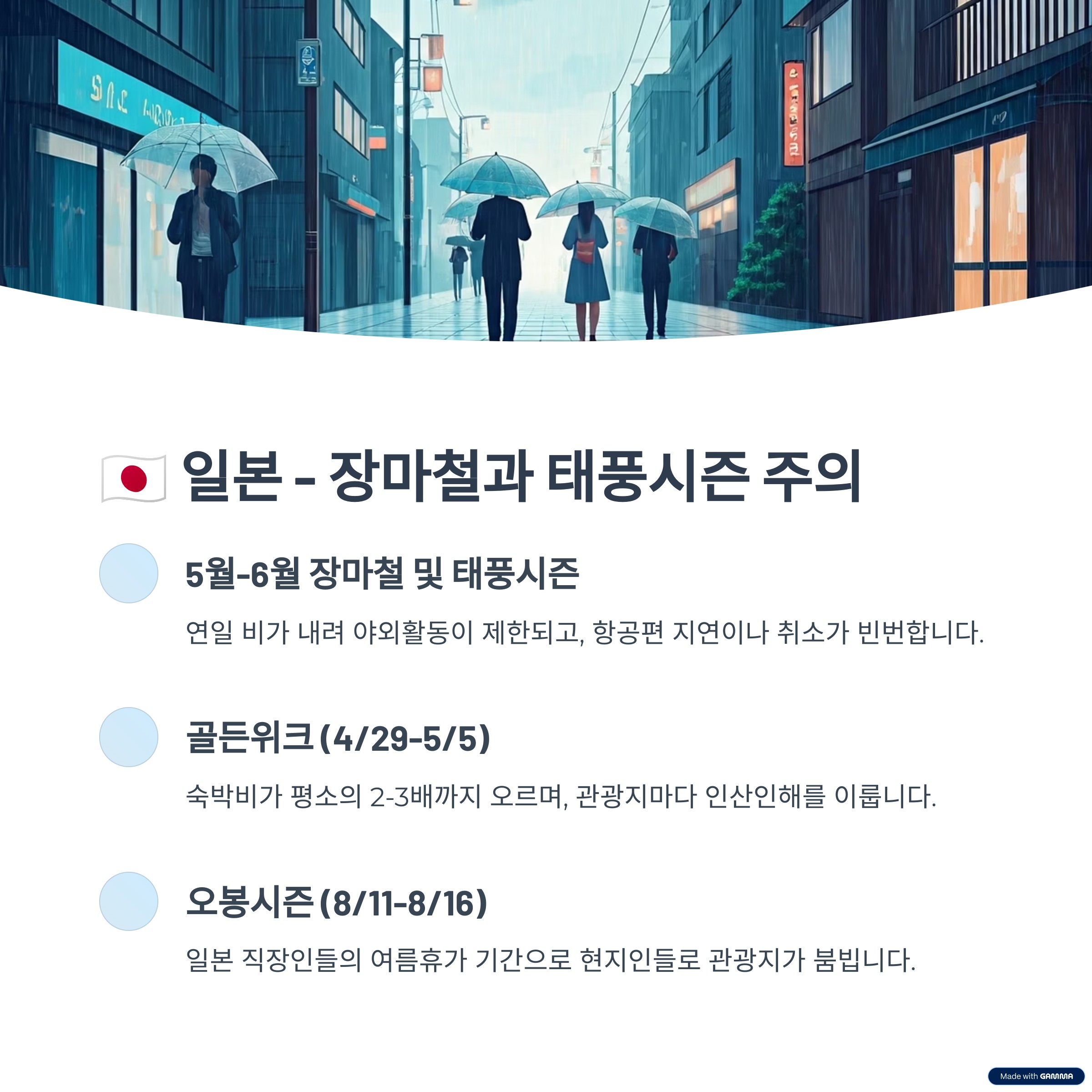 일본은 5월부터 6월까지 장마철(우기)이 지속되며, 오키나와에서 시작하여 후쿠오카, 오사카, 도쿄 순으로 넘어옵니다.