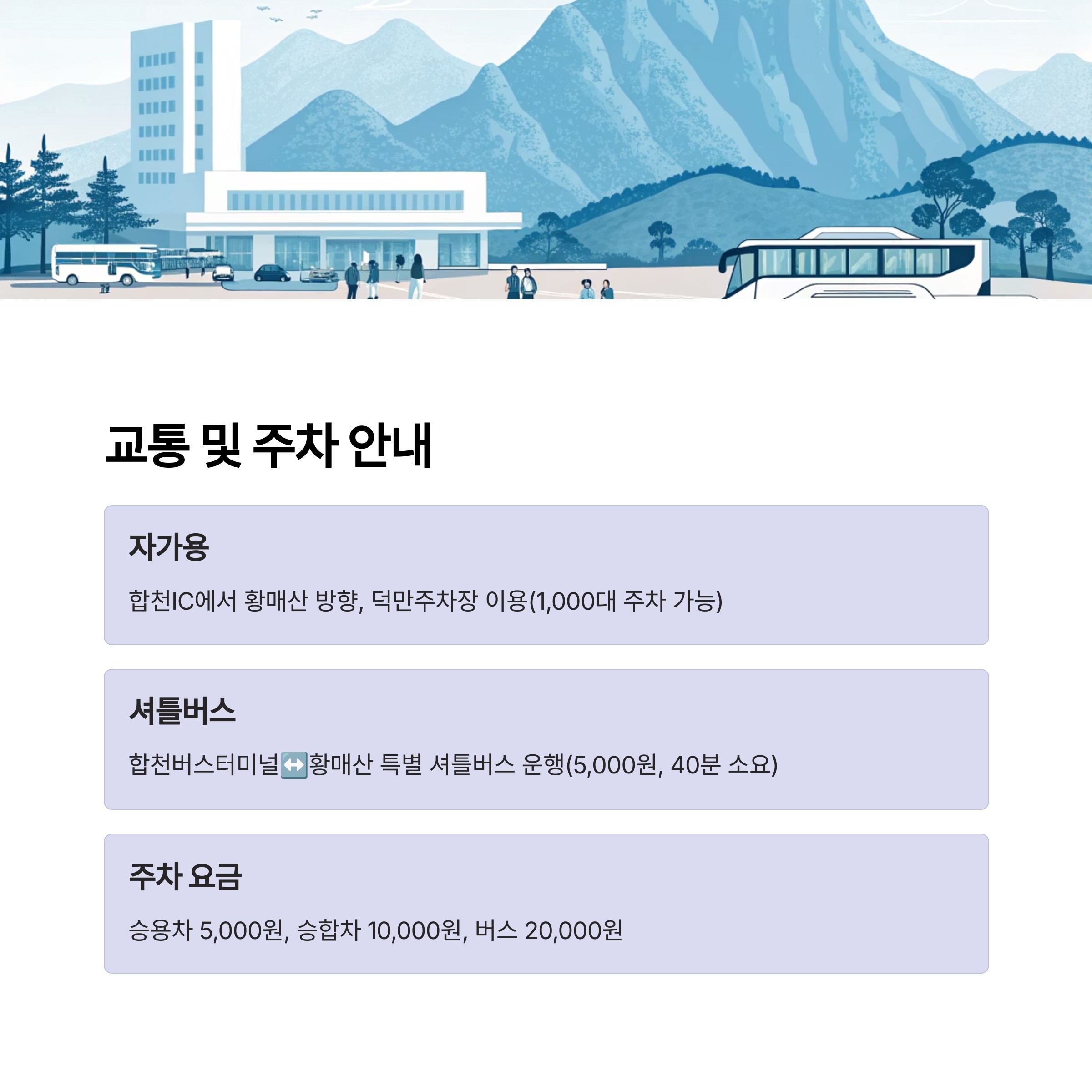 | 터미널→황매산 | 08:00, 10:00, 12:00, 14:00 | 약 40분 | 5,000원 |