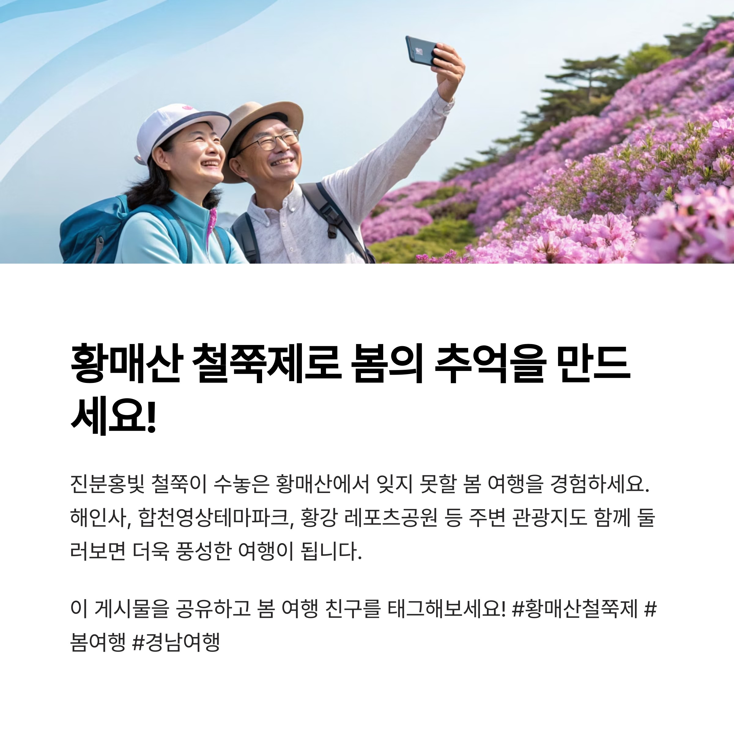 | 철쭉 스탬프투어 | 축제 기간 상시 | 황매산 전역 | 지정된 명소 방문 인증 및 기념품 증정 |