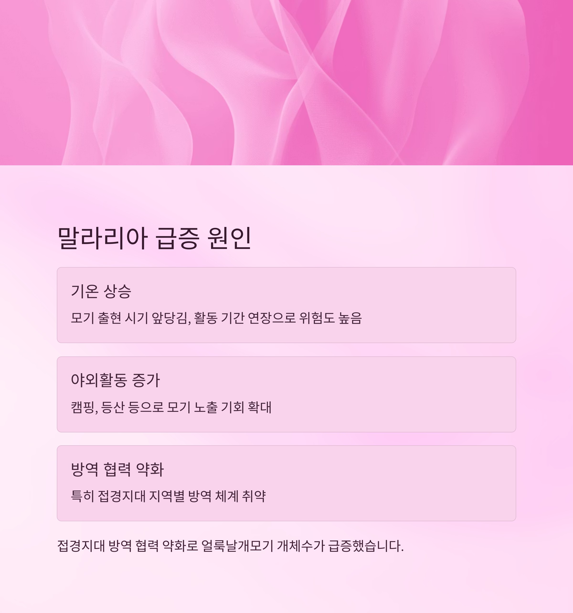 | 야외활동 증가 | 캠핑, 등산 등으로 모기 노출 기회 확대 | 중간 |
