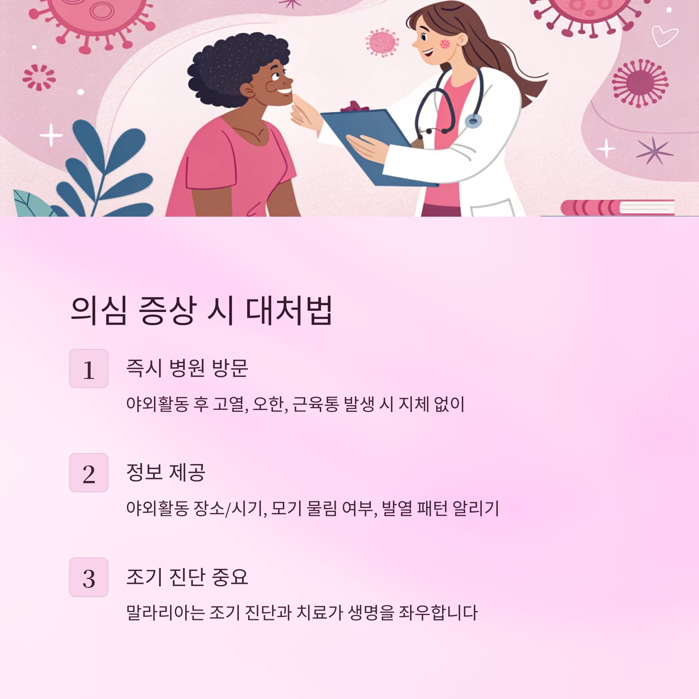 야외활동 후 고열, 오한, 근육통 등 말라리아 의심 증상이 나타나면 지체 없이 의료기관을 방문해야 합니다.