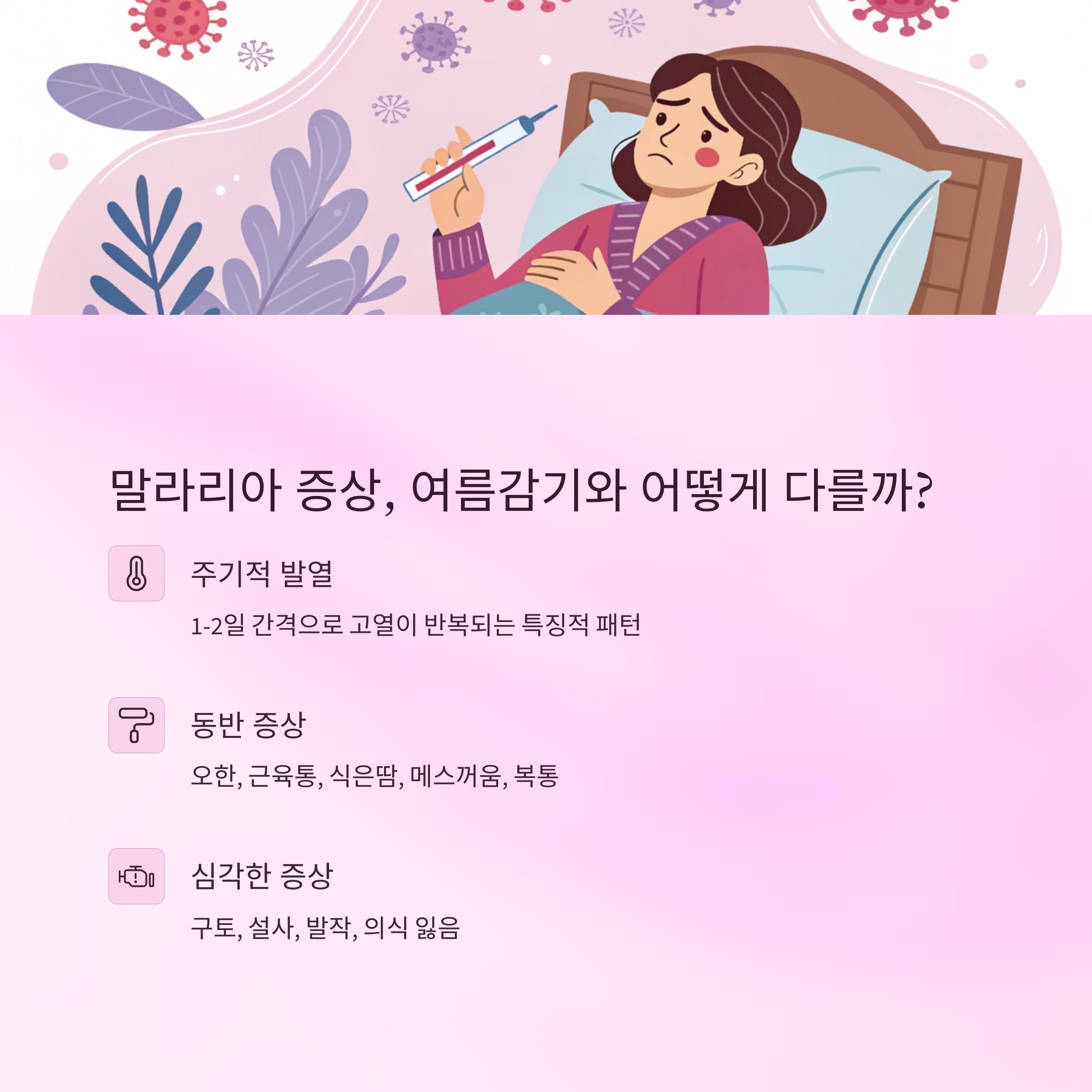 ⚠️ 주의사항: 말라리아는 조기 진단과 치료가 매우 중요합니다. 증상을 방치할 경우 생명에 위험할 수 있으므로 의심되면 반드시 전문의 진료를 받으시기 바랍니다.