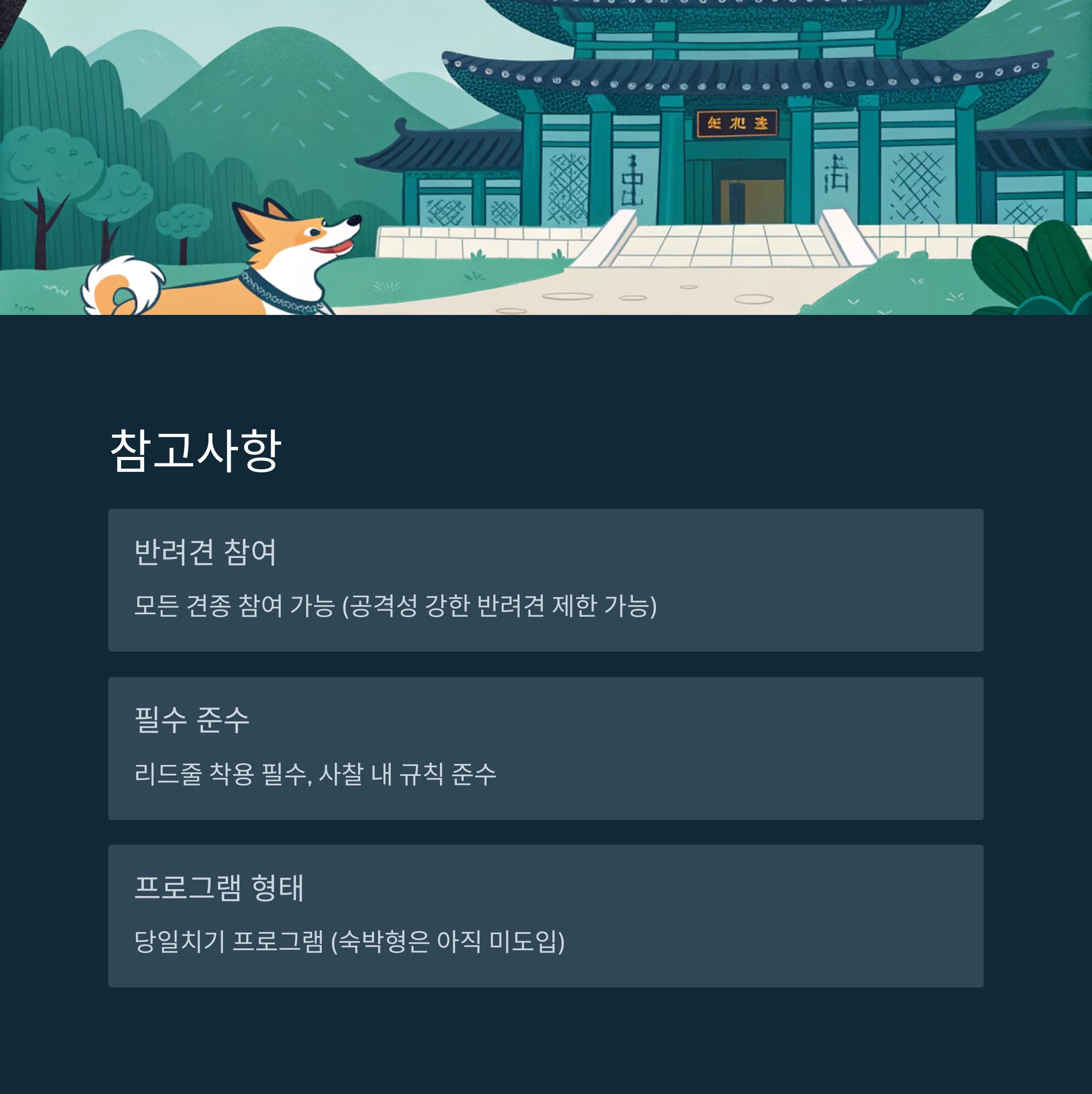 | 특전 | 반려견·보호자 전용 사찰복 대여, 기념품 제공 |