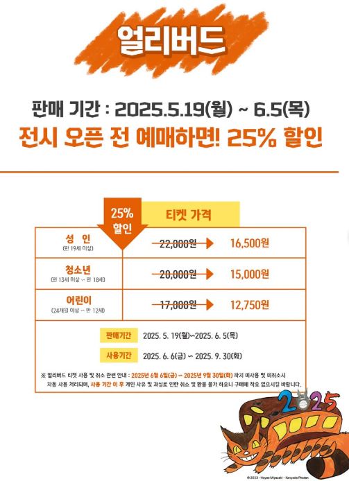 아니메쥬와 지브리전은 2025년 5월 16일 오전 10시부터 인터파크 등에서 얼리버드 티켓 판매를 시작합니다.