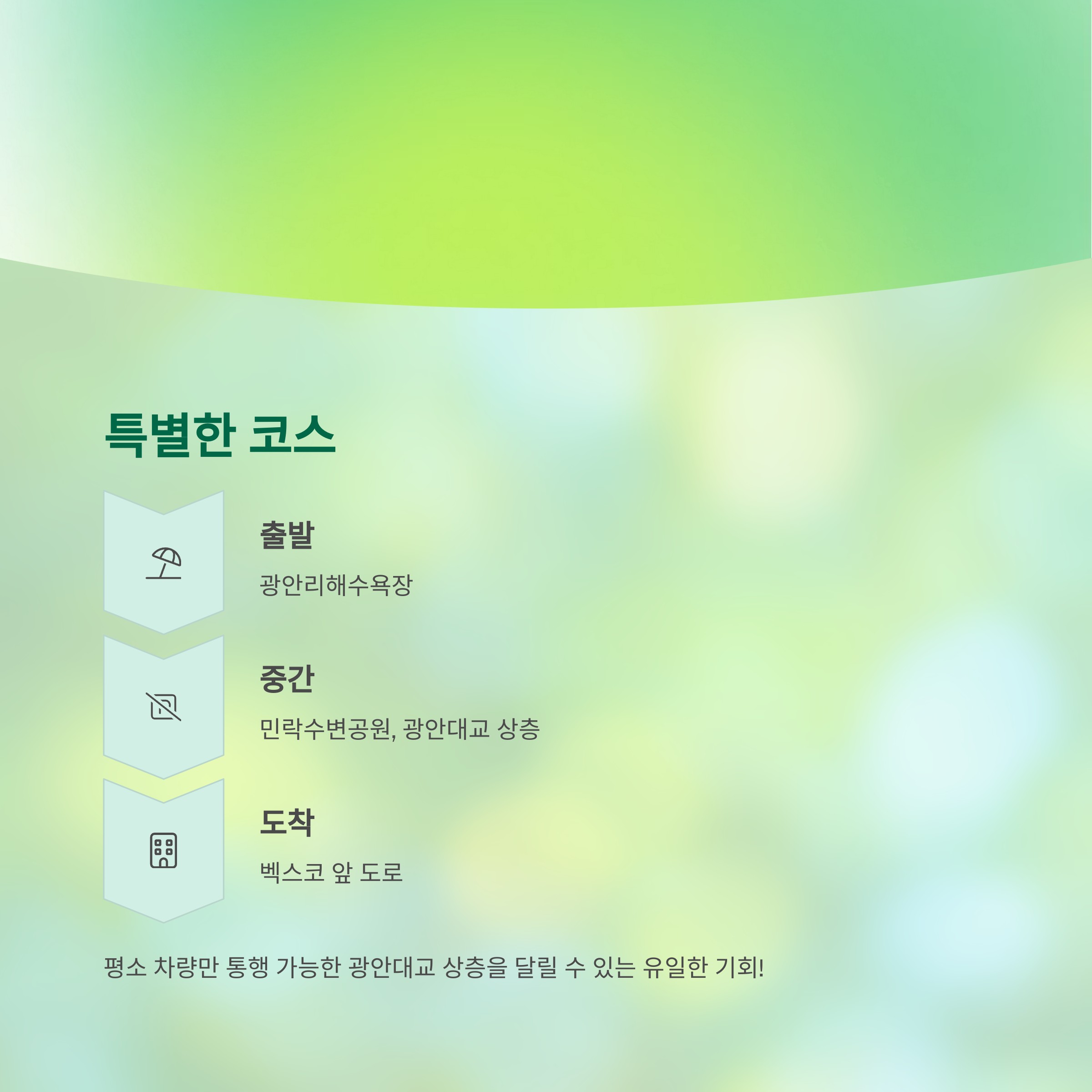 | 중간 | 민락수변공원, 언양삼거리, 광안리해양스포츠센터 | 부산의 아름다운 해안선 따라 달리기 |