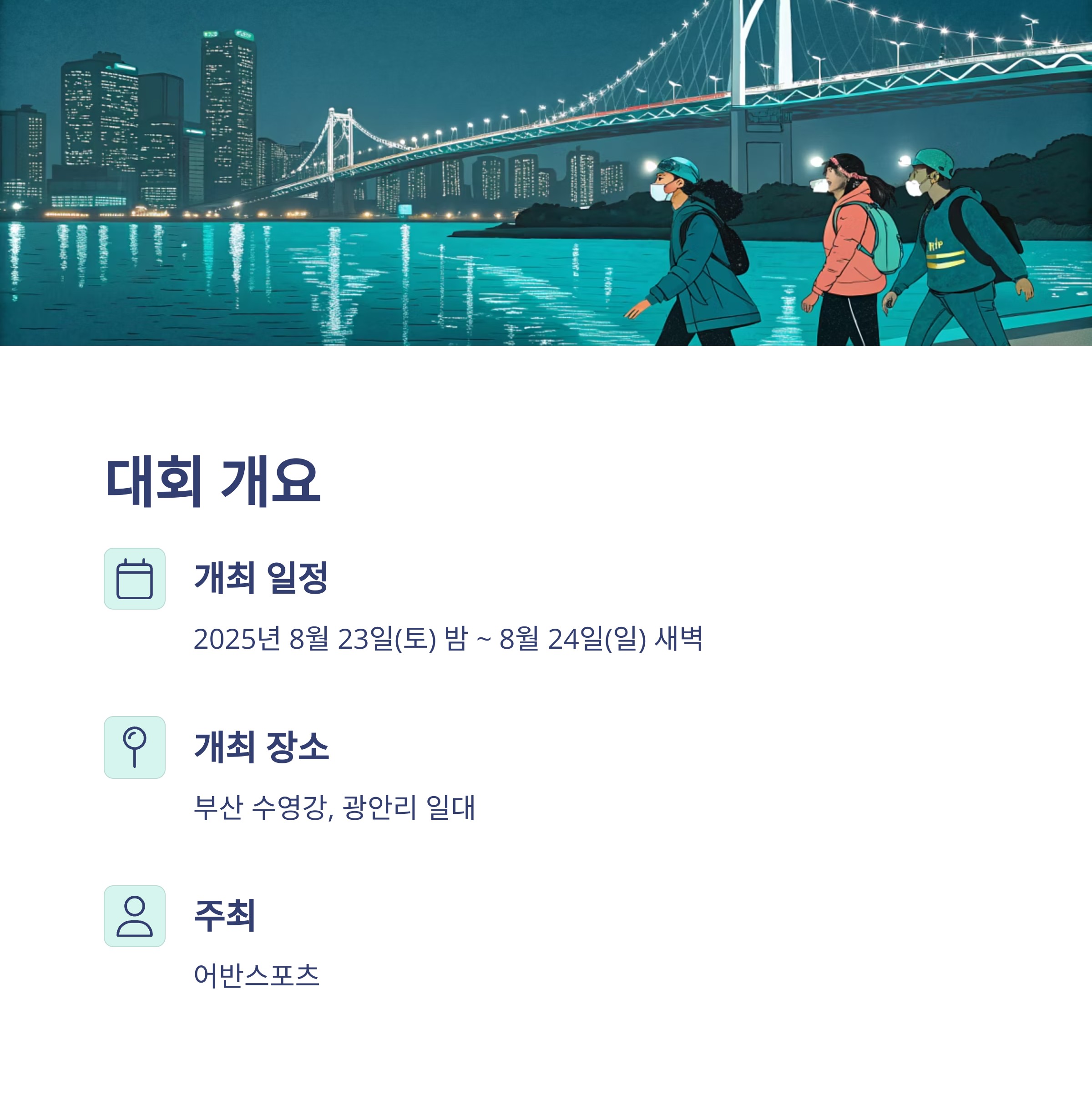 야간 대회 특성상 안전이 최우선입니다. 반사 장비를 착용하고 스태프의 안내를 철저히 따라 주세요.