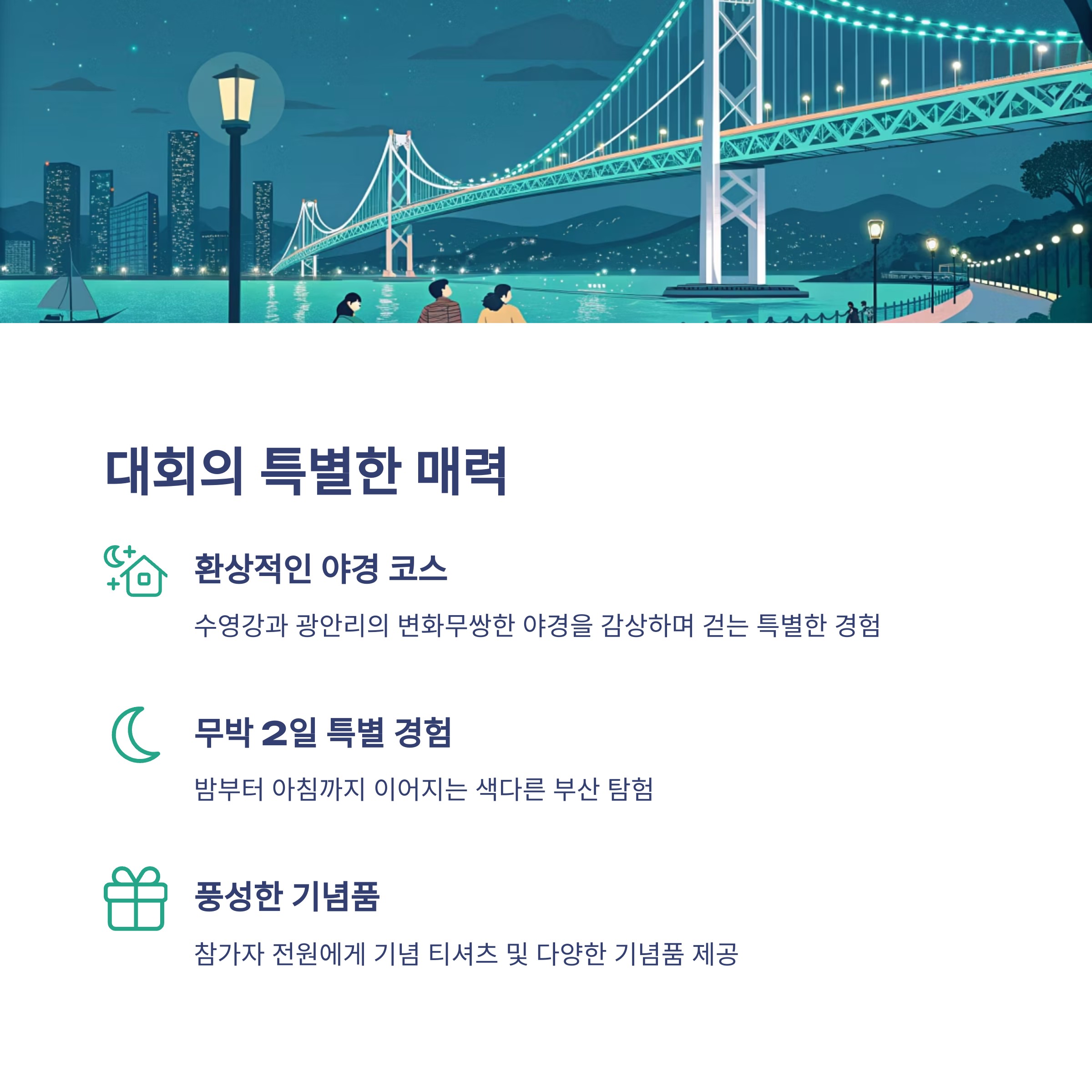특히 부산의 대표적인 야경 명소인 광안대교와 해운대, 수영강 일대를 걸으며 평소에는 경험할 수 없는 부산의 밤풍경을 온몸으로 느낄 수 있습니다. 도시의 불빛과 바다가 만나는 환상적인 광경은 참가자들에게 평생 잊지 못할 추억을 선사할 것입니다.