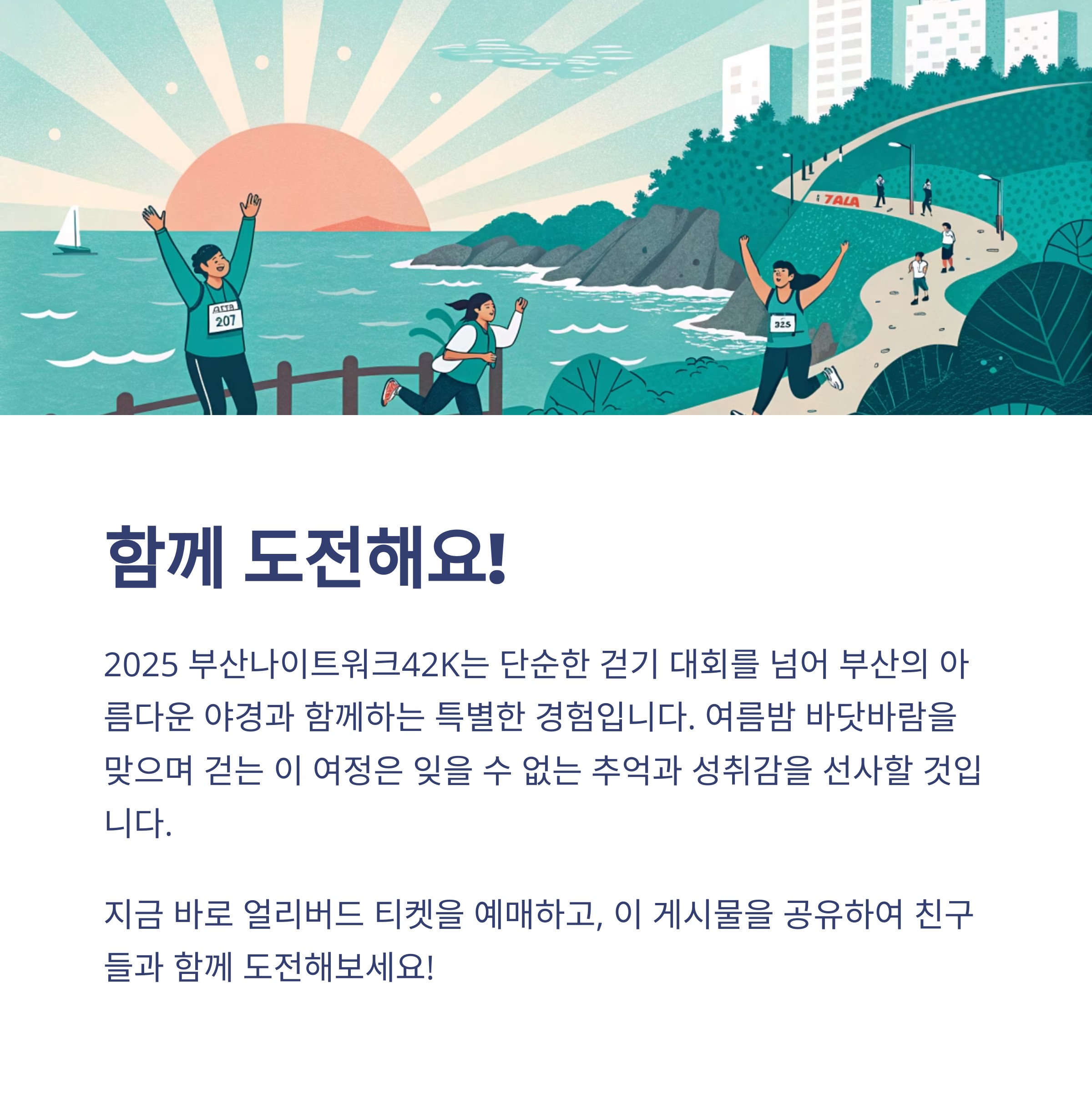 2025 부산나이트워크42K는 단순한 걷기 대회를 넘어서 부산의 아름다운 야경과 함께 자신의 한계에 도전하는 특별한 경험입니다. 여름밤 바닷바람을 맞으며 걷는 이 특별한 여정은 참가자 모두에게 잊을 수 없는 추억과 성취감을 선사할 것입니다.