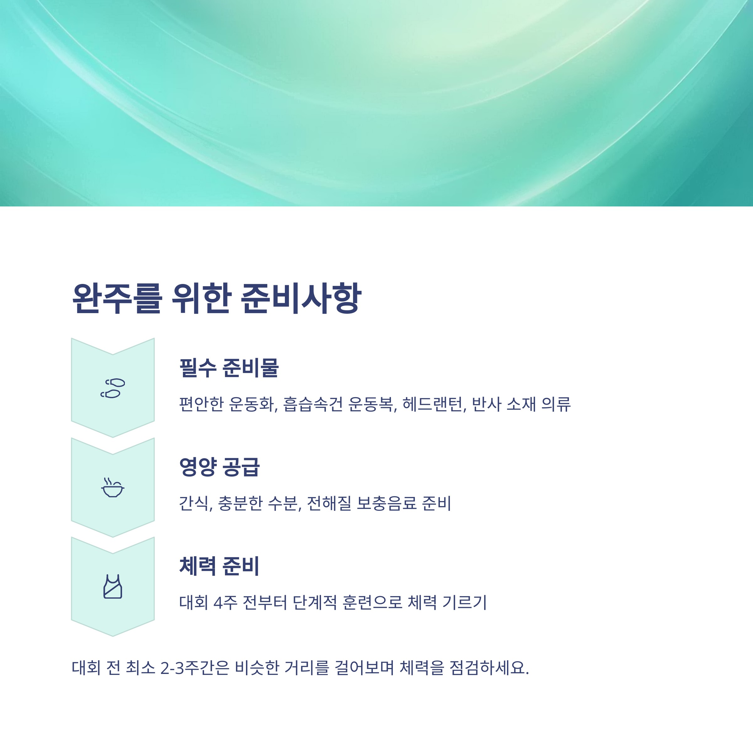 - 1주 전: 가벼운 걷기로 몸 상태 조절