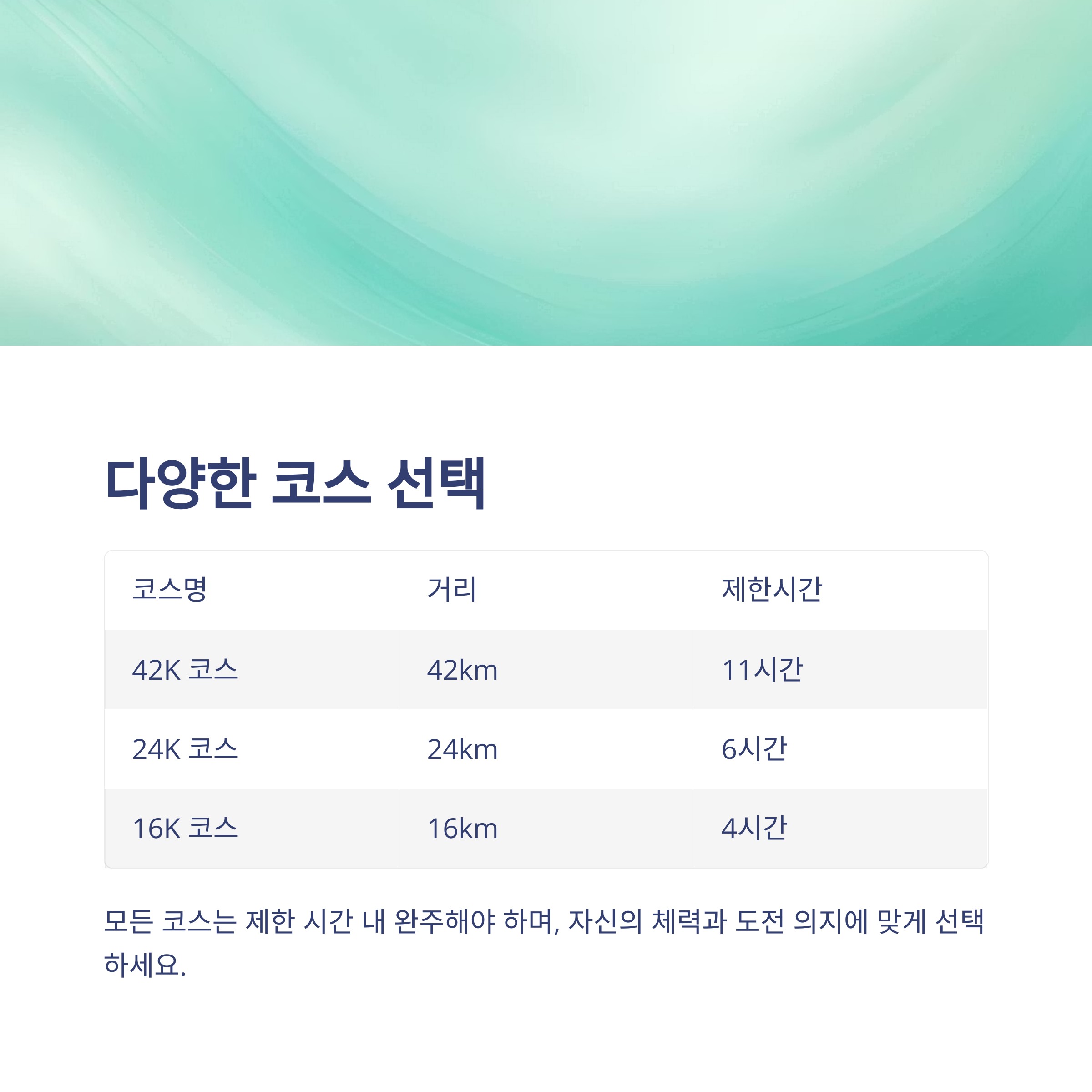 | 42K 코스 | 42km | 11시간 | 대표 코스, 한계 도전 |