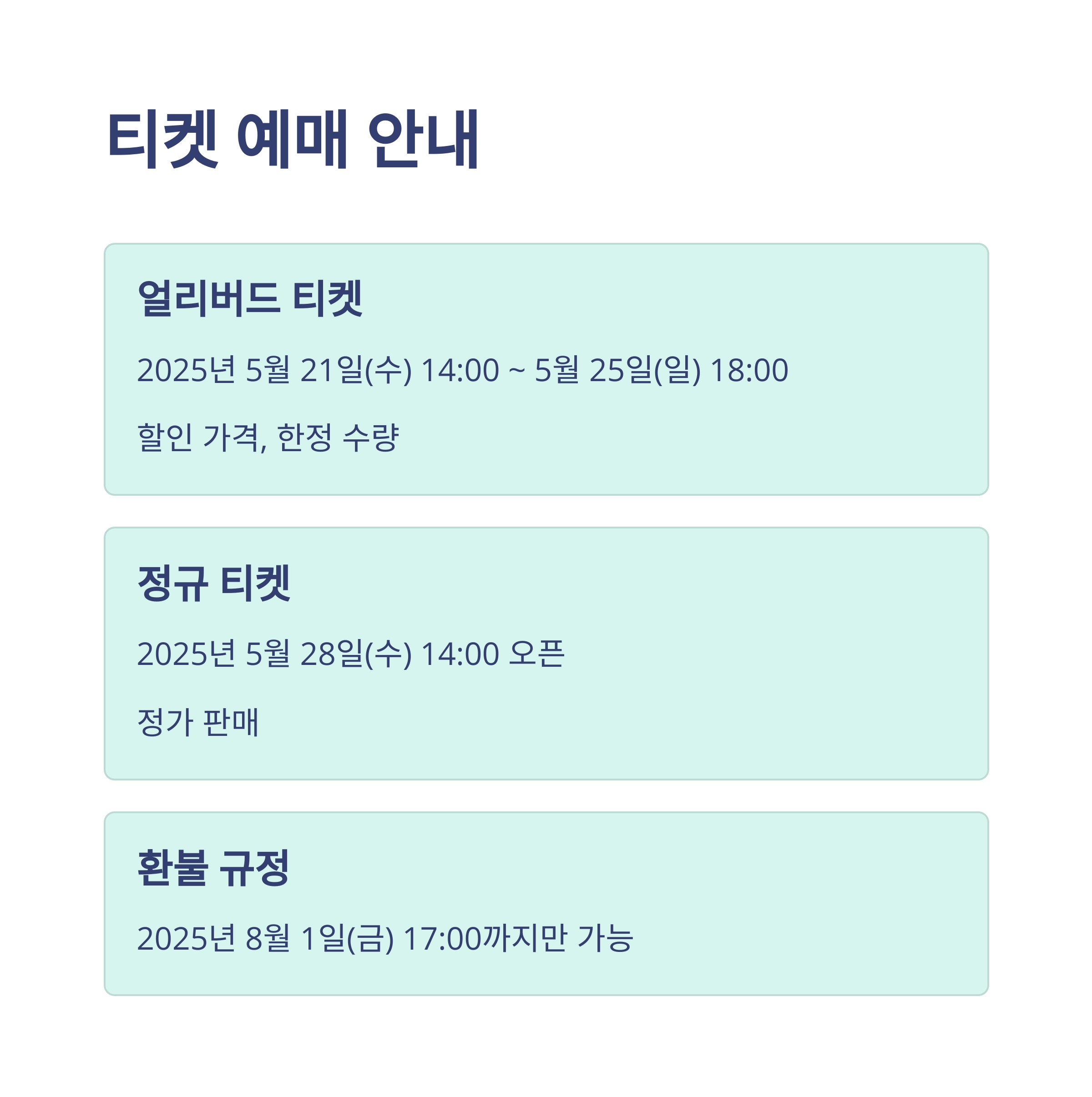 | 얼리버드 티켓 | 2025년 5월 21일(수) 14:00 ~ 5월 25일(일) 18:00 | 할인 가격, 한정 수량 |