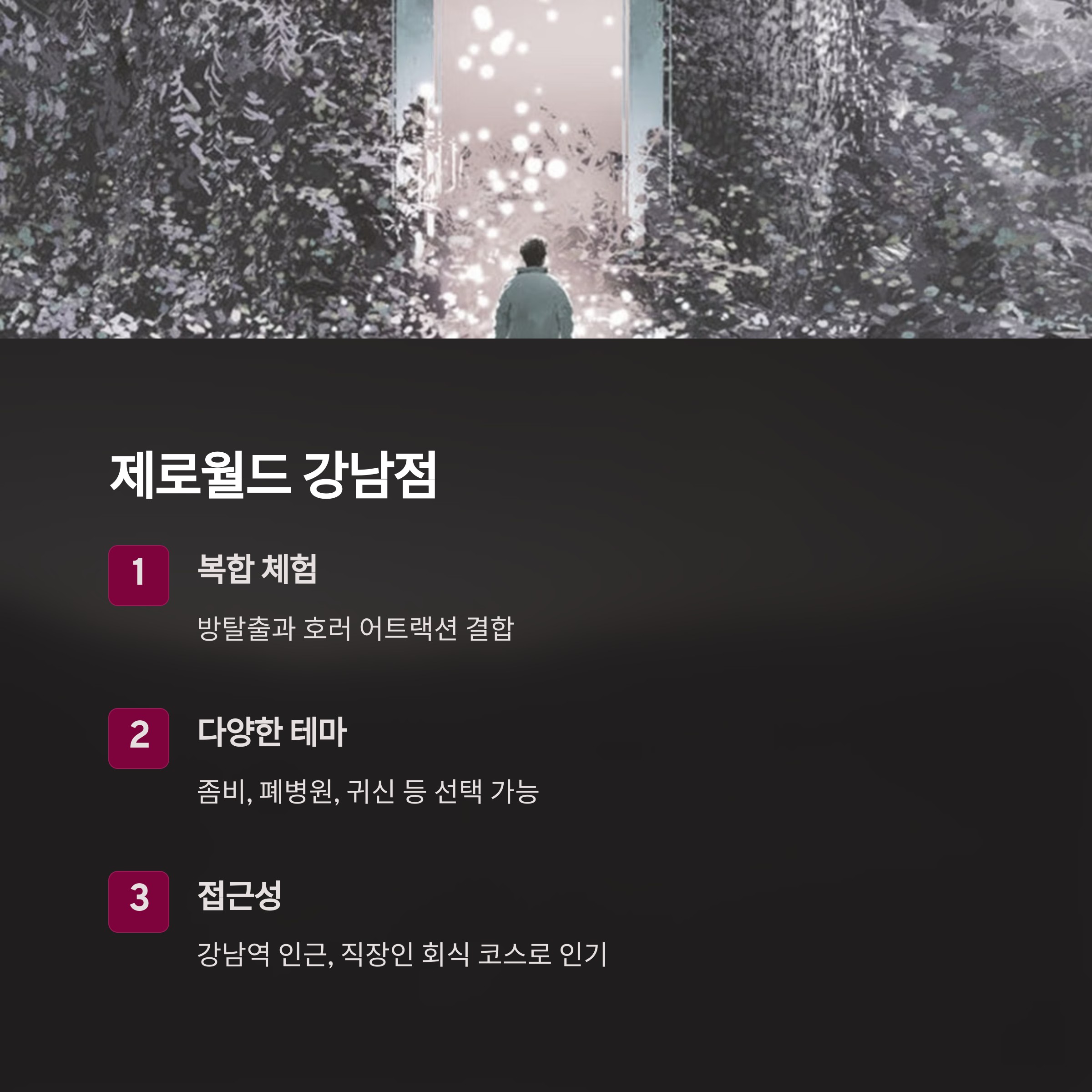 강남역 인근에 위치한 제로월드 강남점은 방탈출과 호러 어트랙션을 결합한 복합 체험관입니다.