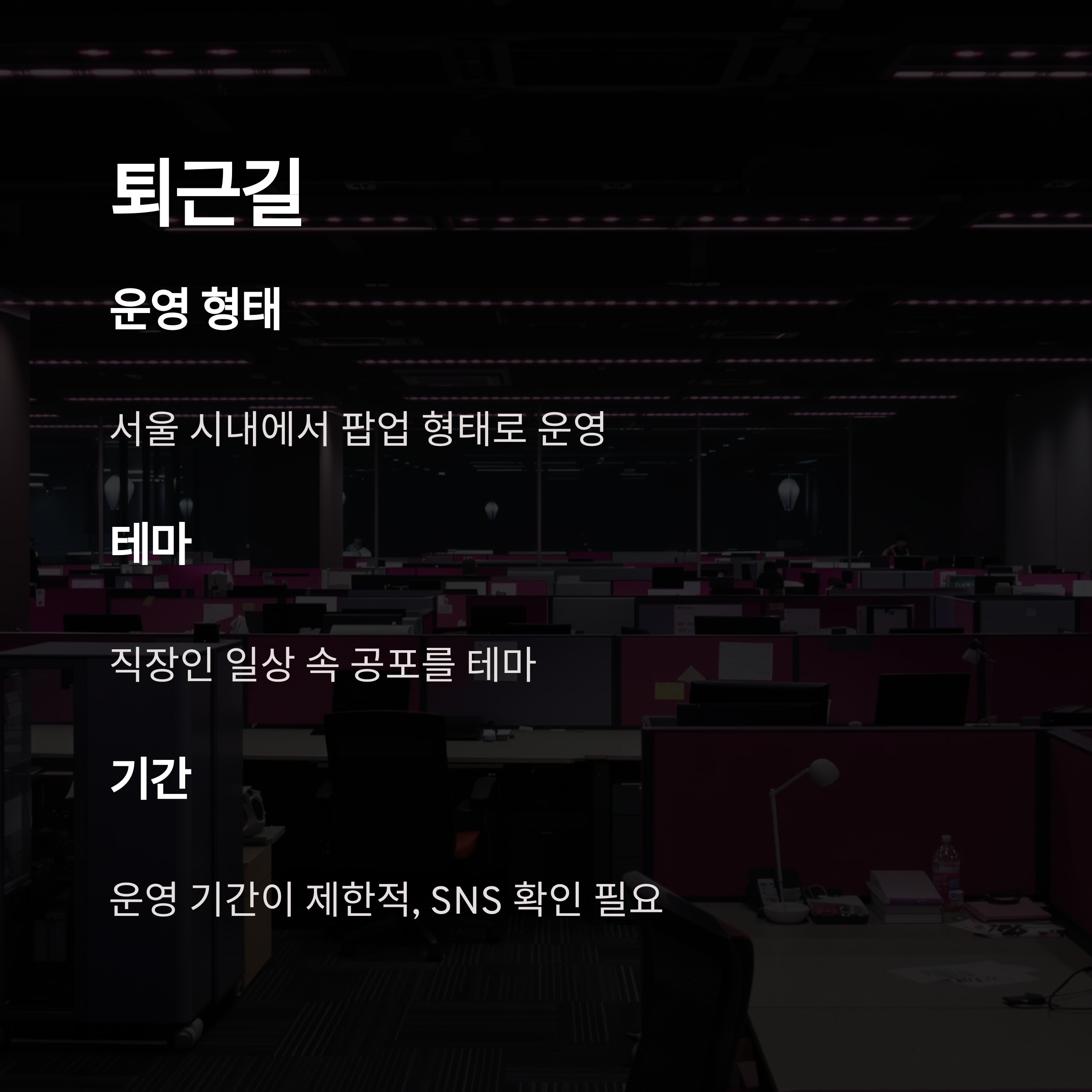 서울 시내에서 팝업 형태로 운영되는 퇴근길은 직장인 일상 속 공포를 테마로 한 신개념 호러 체험입니다.
