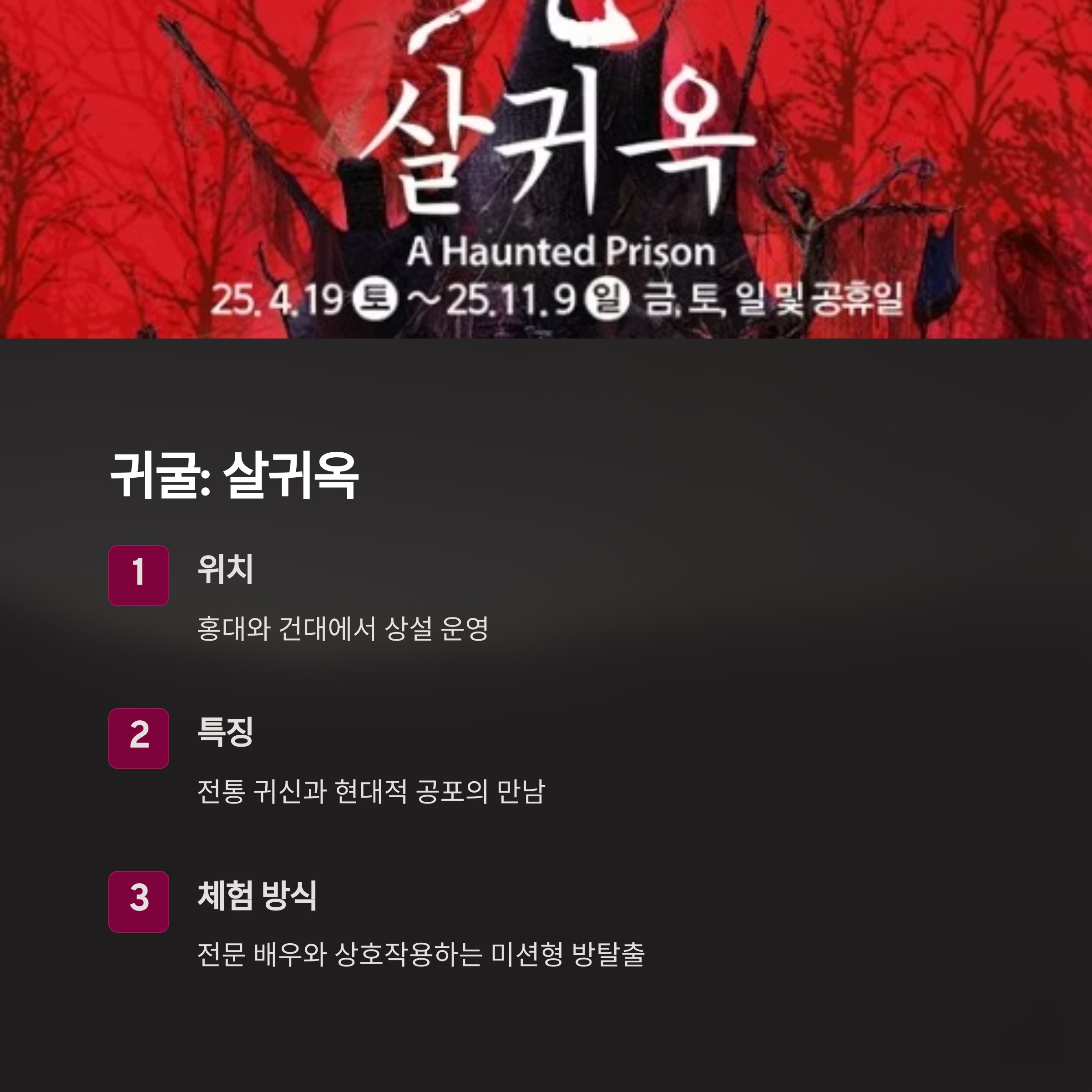 홍대와 건대에서 상설 운영되는 귀굴: 살귀옥은 전통 귀신과 현대적 공포를 완벽하게 결합한 미션형 방탈출 공포체험관입니다.