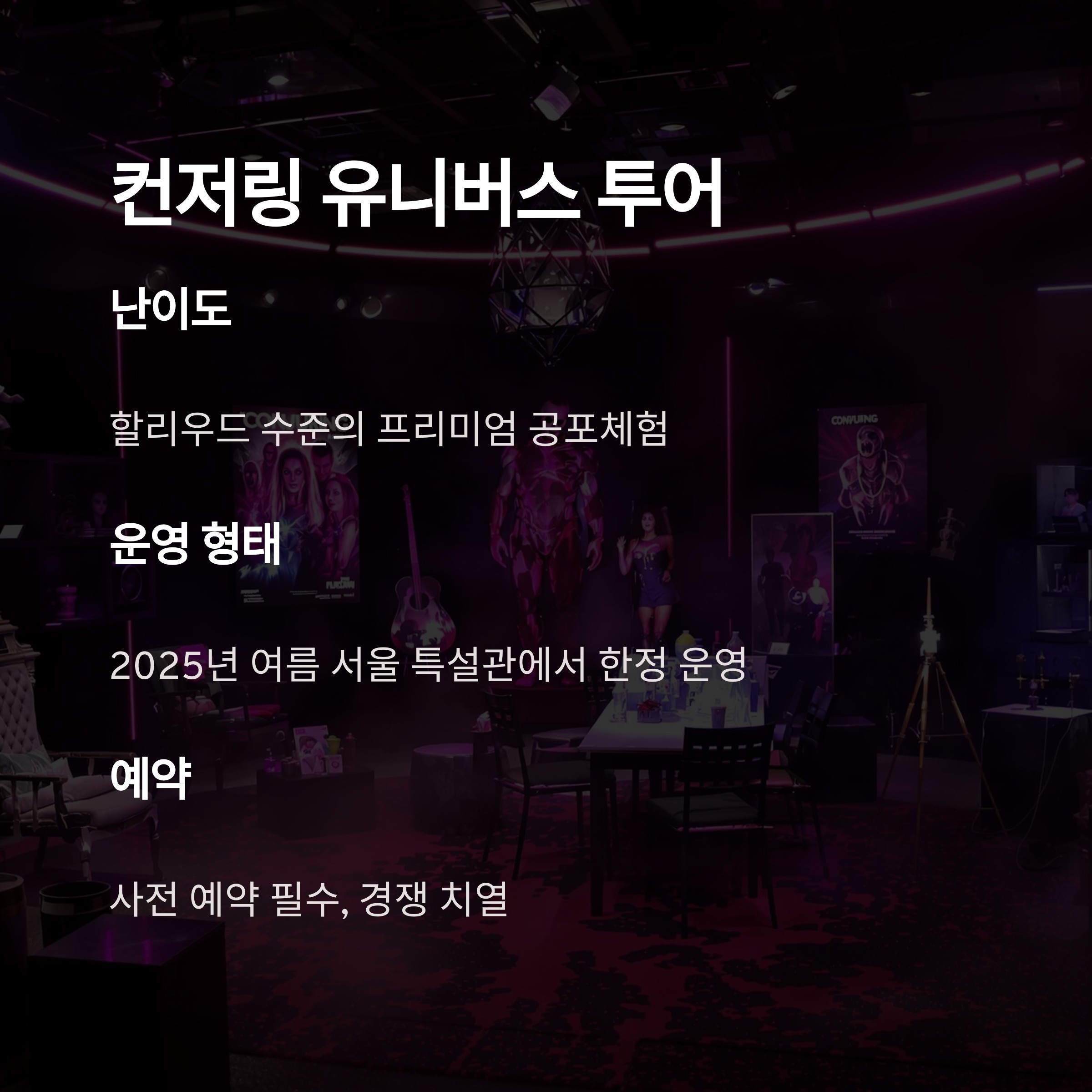2025년 여름 서울 특설관에서 한정 운영되는 컨저링 유니버스 투어는 할리우드 블록버스터 '컨저링' 세계관을 그대로 재현한 프리미엄 공포체험입니다.