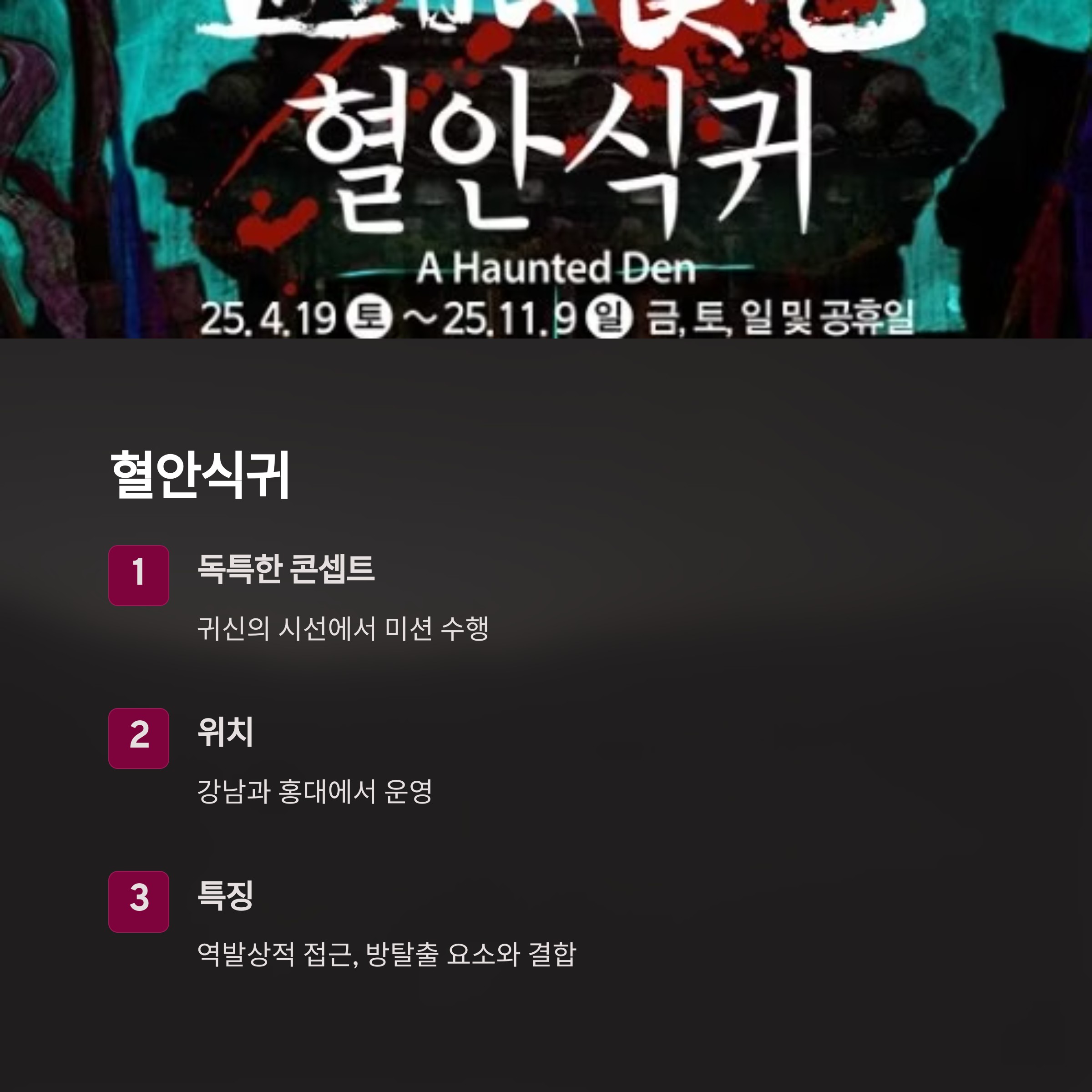강남과 홍대에서 운영되는 혈안식귀는 참가자들이 귀신의 시선에서 미션을 수행하는 독특한 콘셉트의 호러 어트랙션입니다.