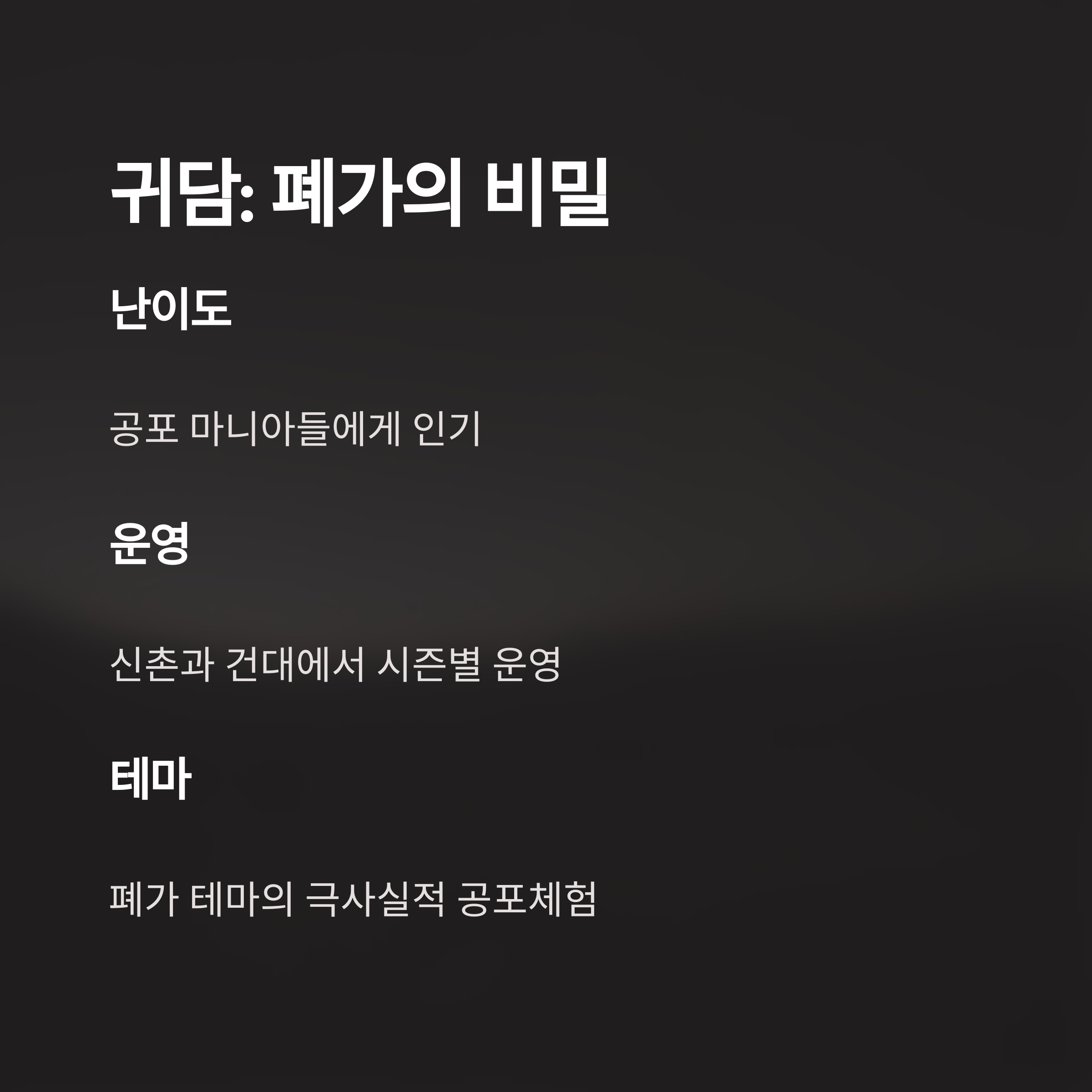 신촌과 건대 등에서 시즌별 운영되는 귀담: 폐가의 비밀은 폐가 테마의 극사실적 공포체험을 제공합니다.