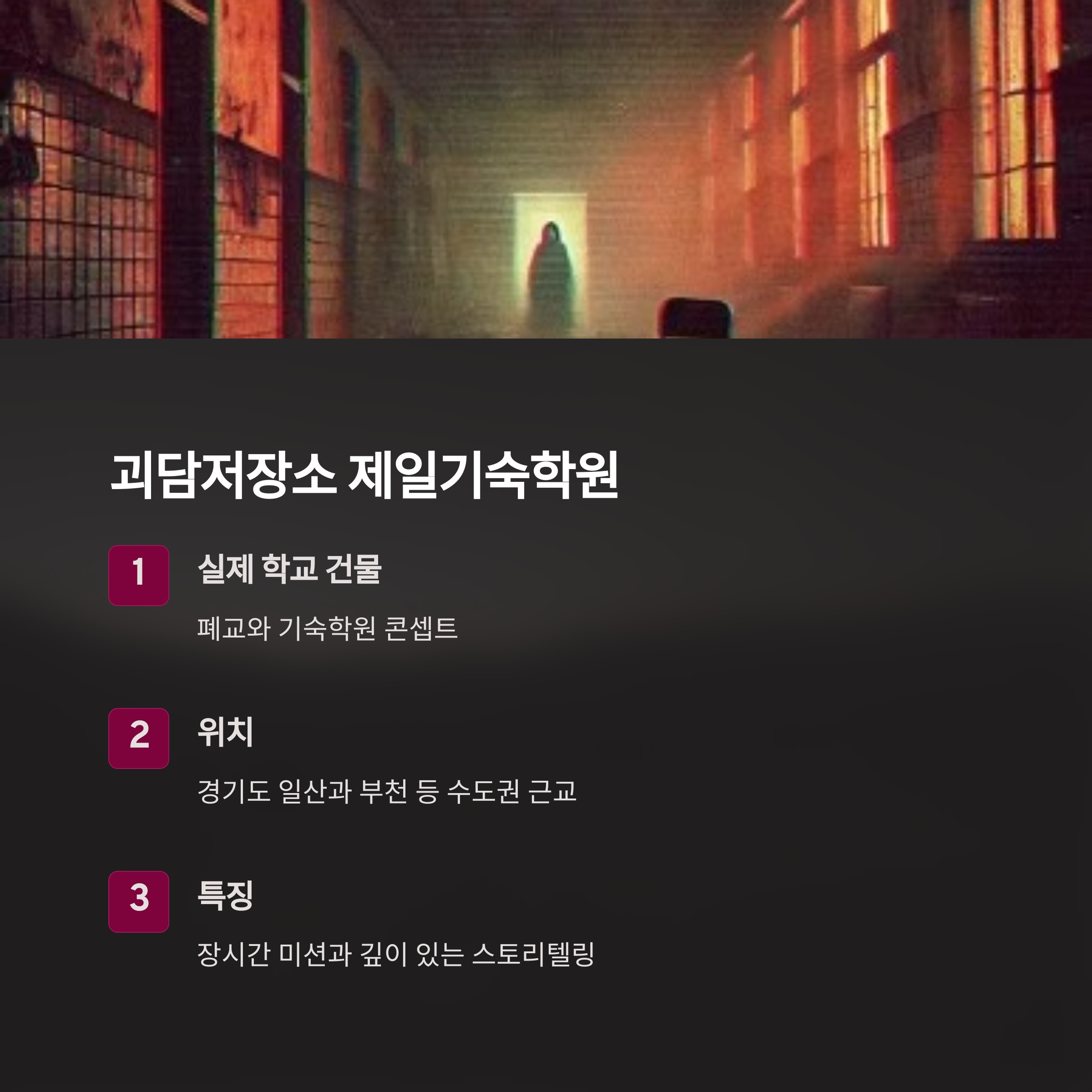 경기도 일산과 부천 등 수도권 근교에서 인기를 끌고 있는 괴담저장소 제일기숙학원은 실제 학교 건물을 활용한 대형 호러 체험관입니다.