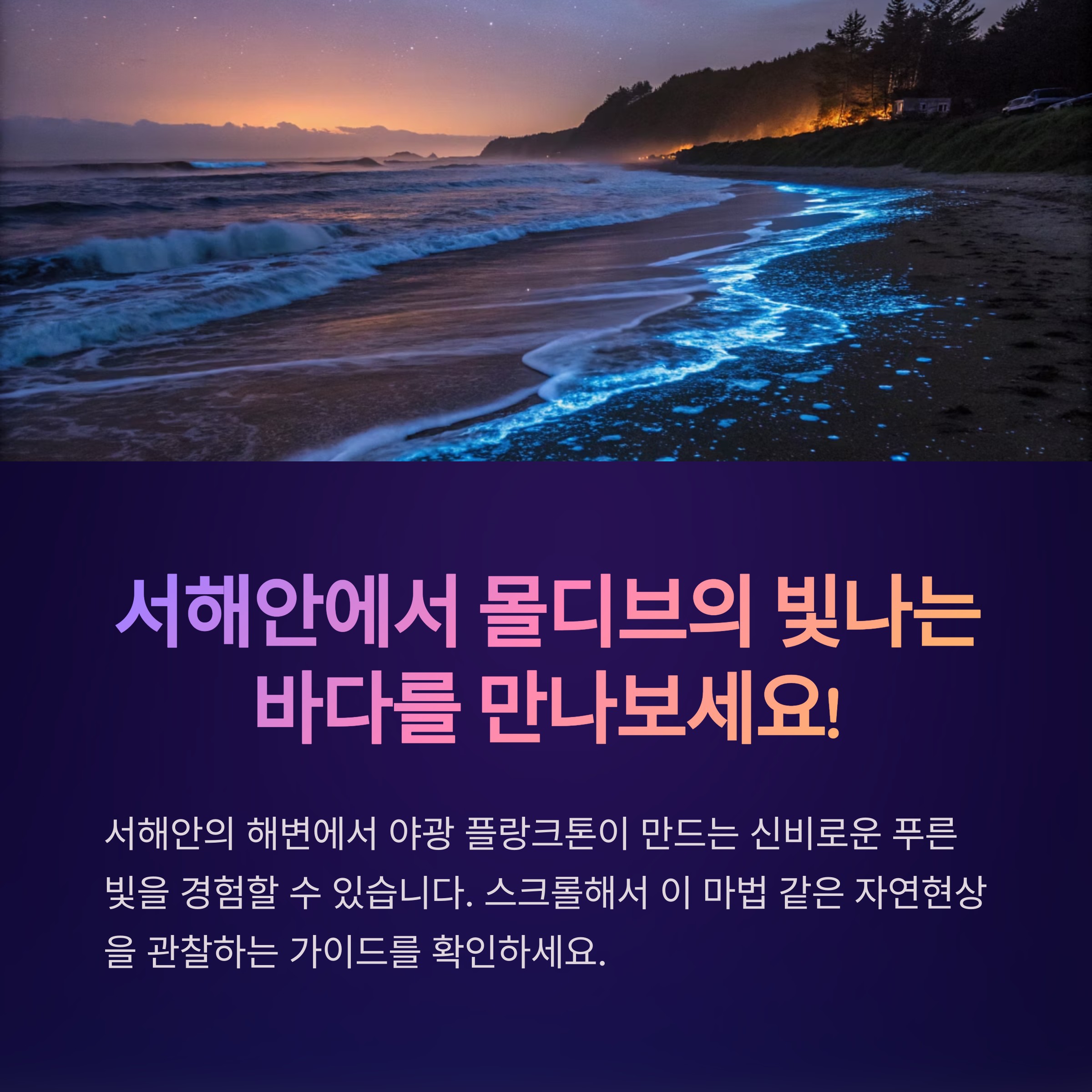 경기도 화성(전곡항, 궁평항)과 충남 서천(춘장대 해수욕장, 홍원항 등)의 바닷가에서 만날 수 있는 빛나는 현상은 야광 플랑크톤의 신비로운 생체발광입니다. 특히 5~6월 새벽, 달빛이 적은 날에는 서해안에서 이 마법 같은 광경을 경험할 수 있는 확률이 높아집니다.