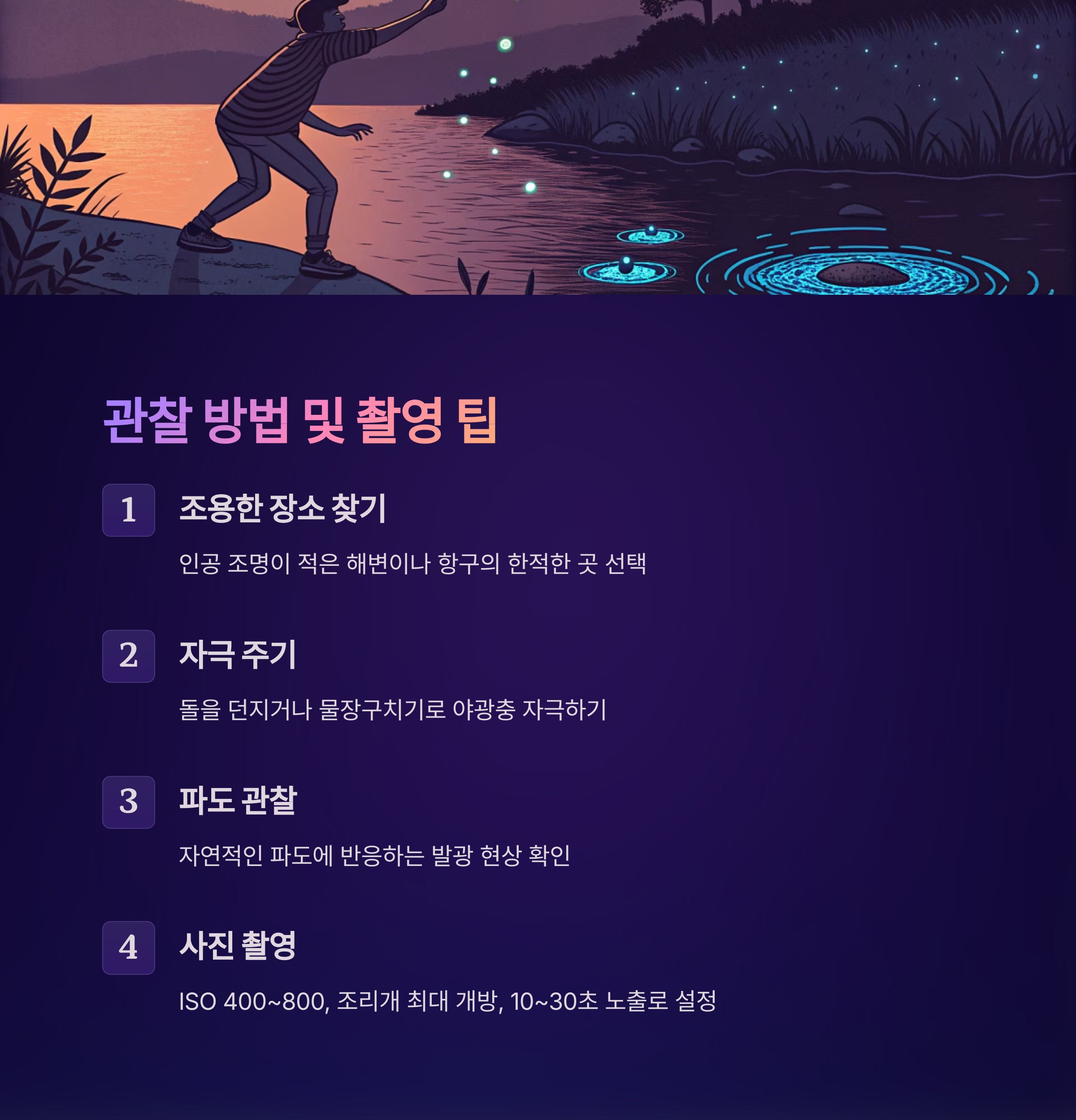 - 날씨: 달빛이 적고 바람이 약한 날 (잔잔한 바다일수록 관찰 용이)