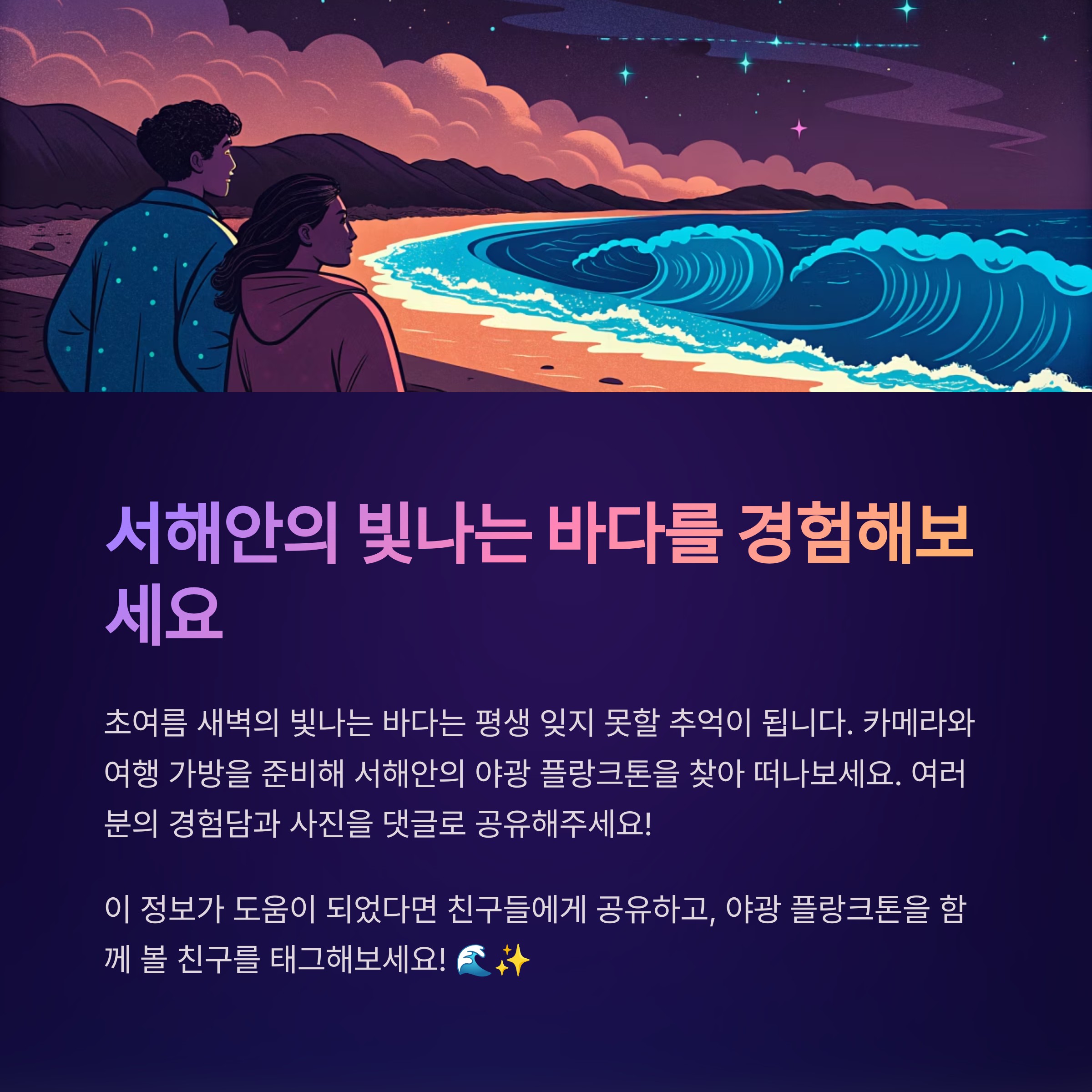 직접 경험하고 돌아온 여행자들의 말에 따르면, 초여름 새벽의 빛나는 바다는 평생 잊지 못할 추억이 된다고 합니다. 지금 바로 카메라와 여행 가방을 준비해 서해안의 빛나는 바다를 찾아 떠나보는 것은 어떨까요?