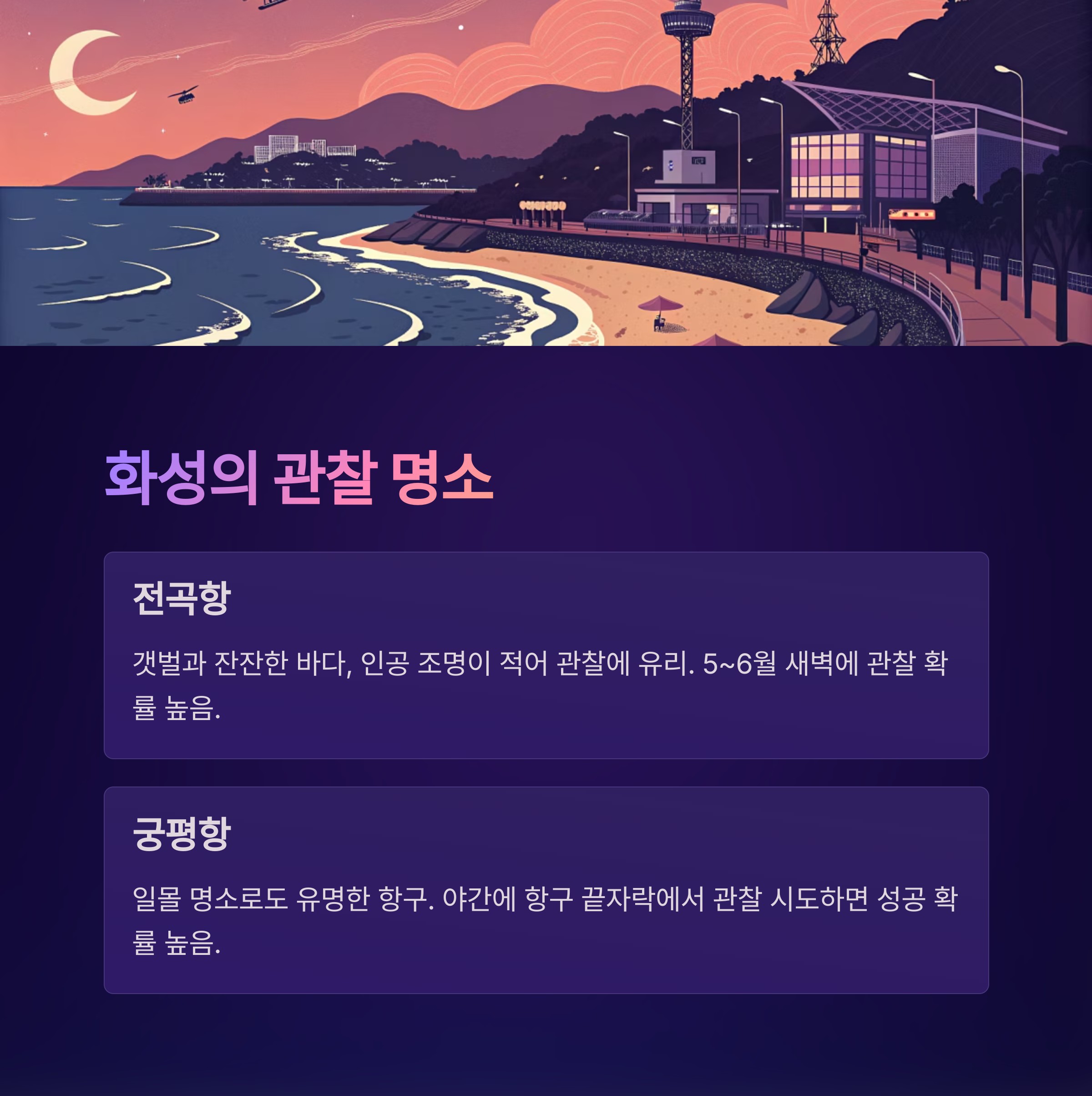 | 장소명 | 관찰 가능성 | 특징 | 추천 활동 |