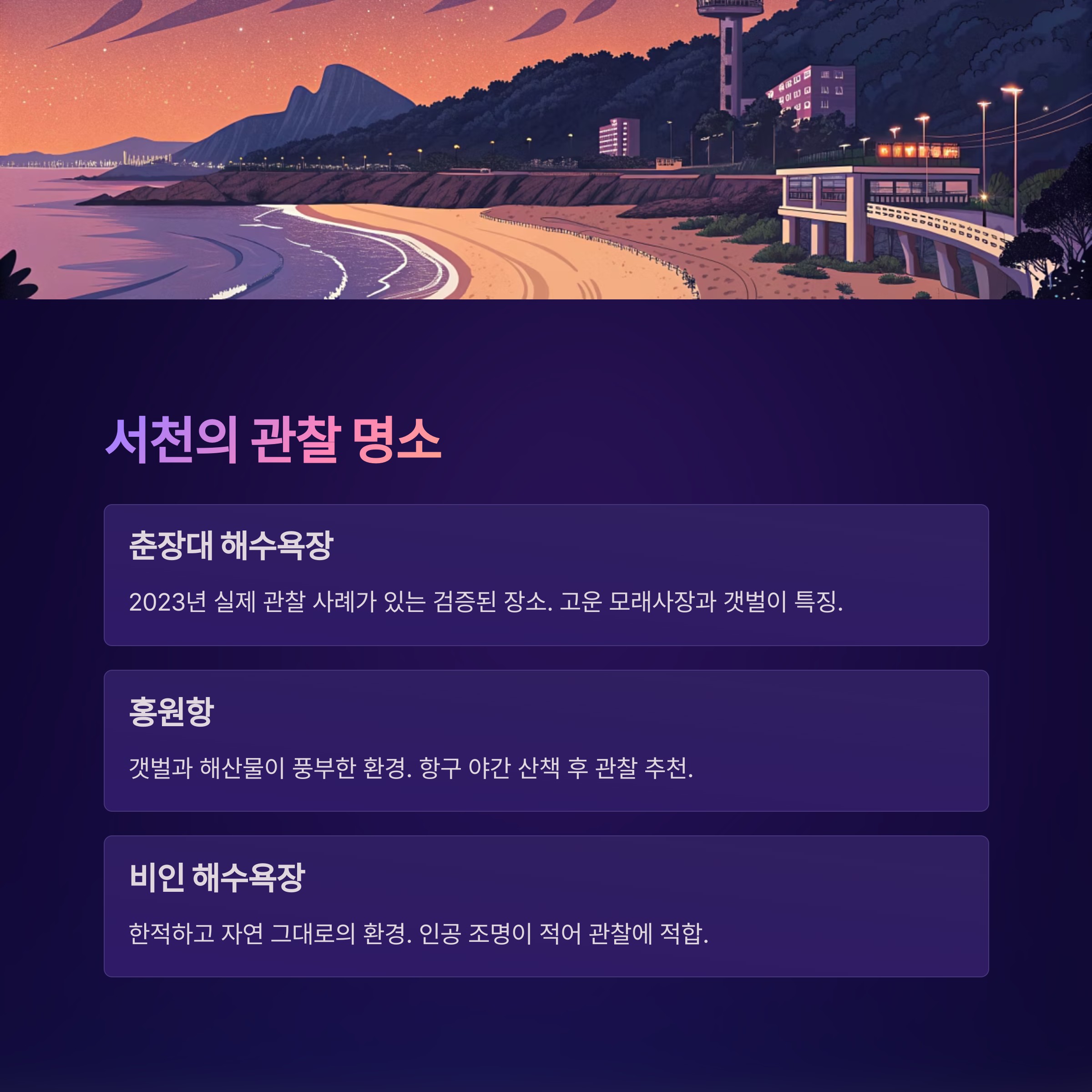 | 비인 해수욕장 | 중 | 서천군 비인면에 위치한 작은 해변으로, 한적하고 자연 그대로의 환경. 인공 조명이 적음 | 새벽 해변 산책, 물장구로 빛 확인 |