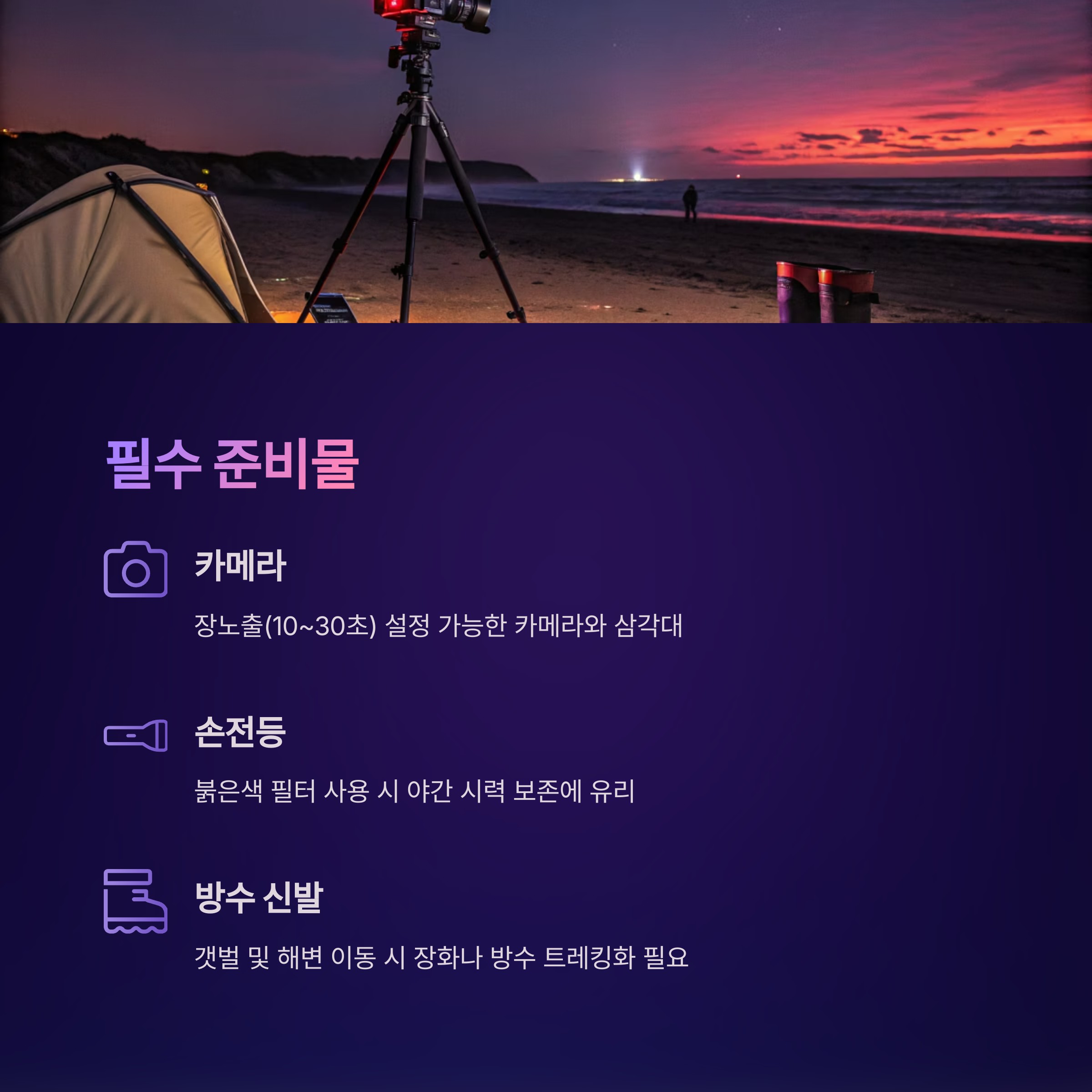 - 야간 해변은 시야가 제한적이므로 항상 동반자와 함께 이동하세요.