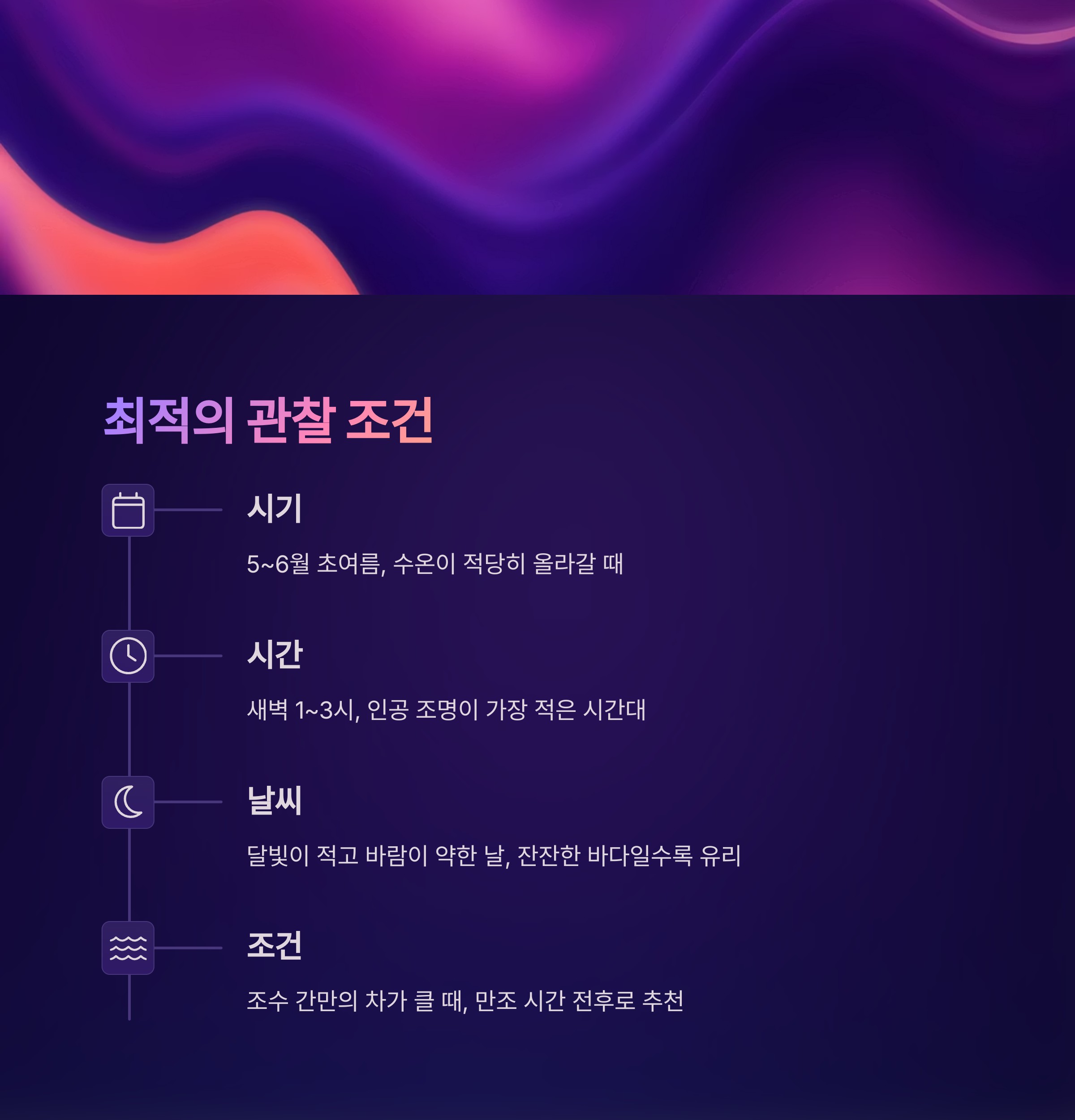 - 날씨: 달빛이 적고 바람이 약한 날 (잔잔한 바다일수록 관찰 용이)