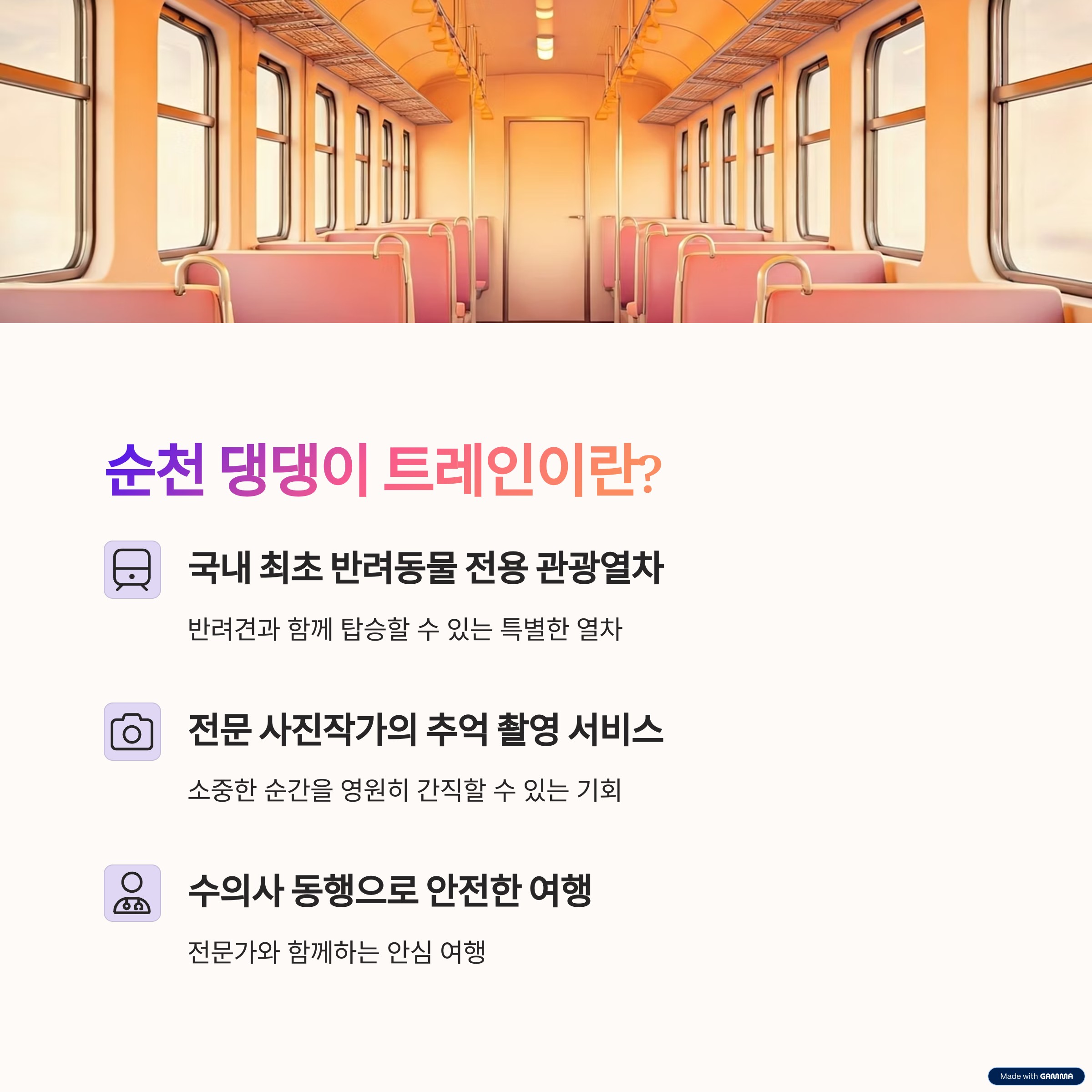 순천 댕댕이 트레인은 국내 최초로 반려동물과 함께 탑승할 수 있는 특별한 관광열차입니다. 아름다운 순천만의 자연경관을 배경으로 반려견과 함께 잊지 못할 추억을 만들 수 있는 독특한 여행 경험을 제공합니다.