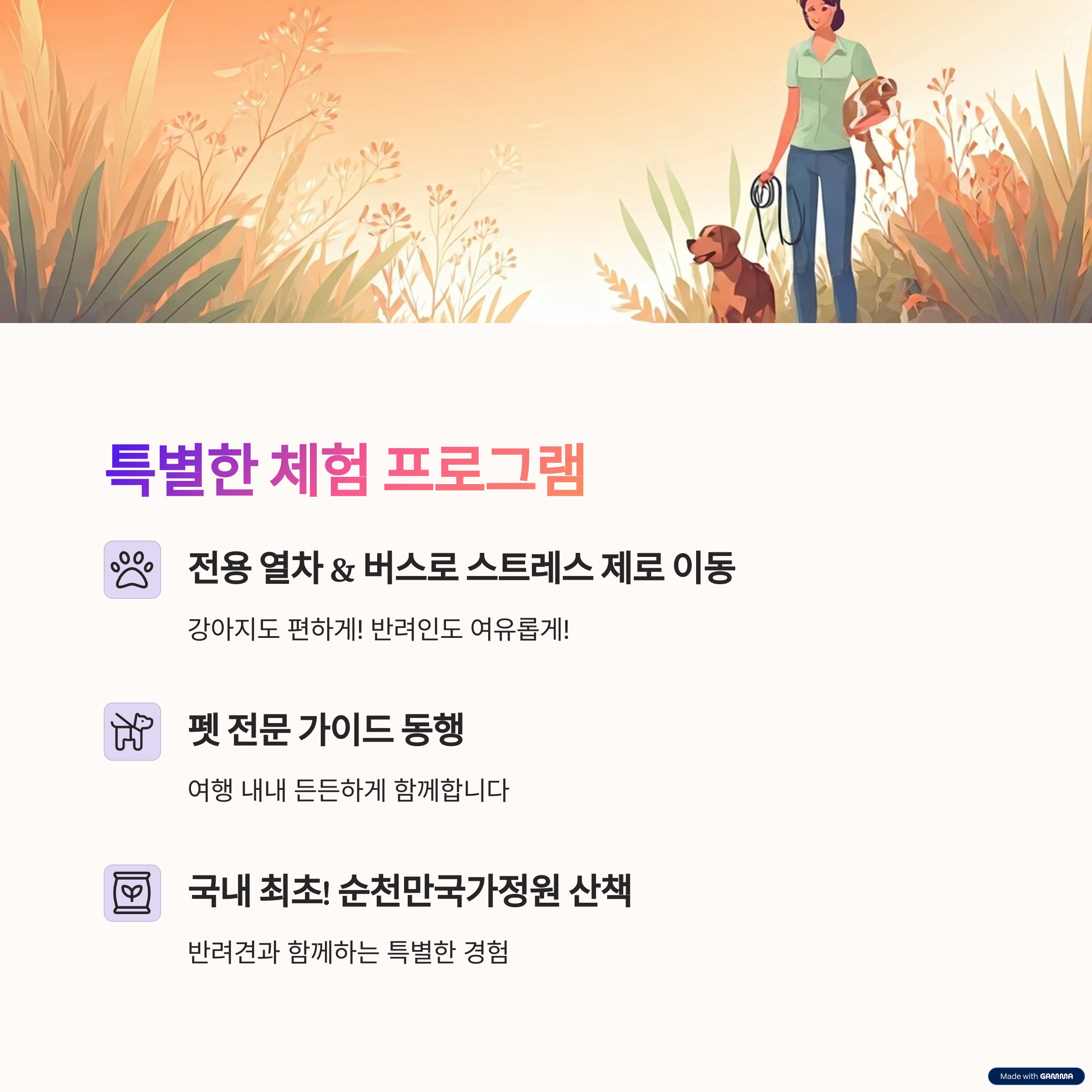 특히 이번 여행은 순천만국가정원 관람을 중심으로 진행되며, 반려동물과 함께 산책할 수 있는 구간이 별도로 마련되어 있습니다.