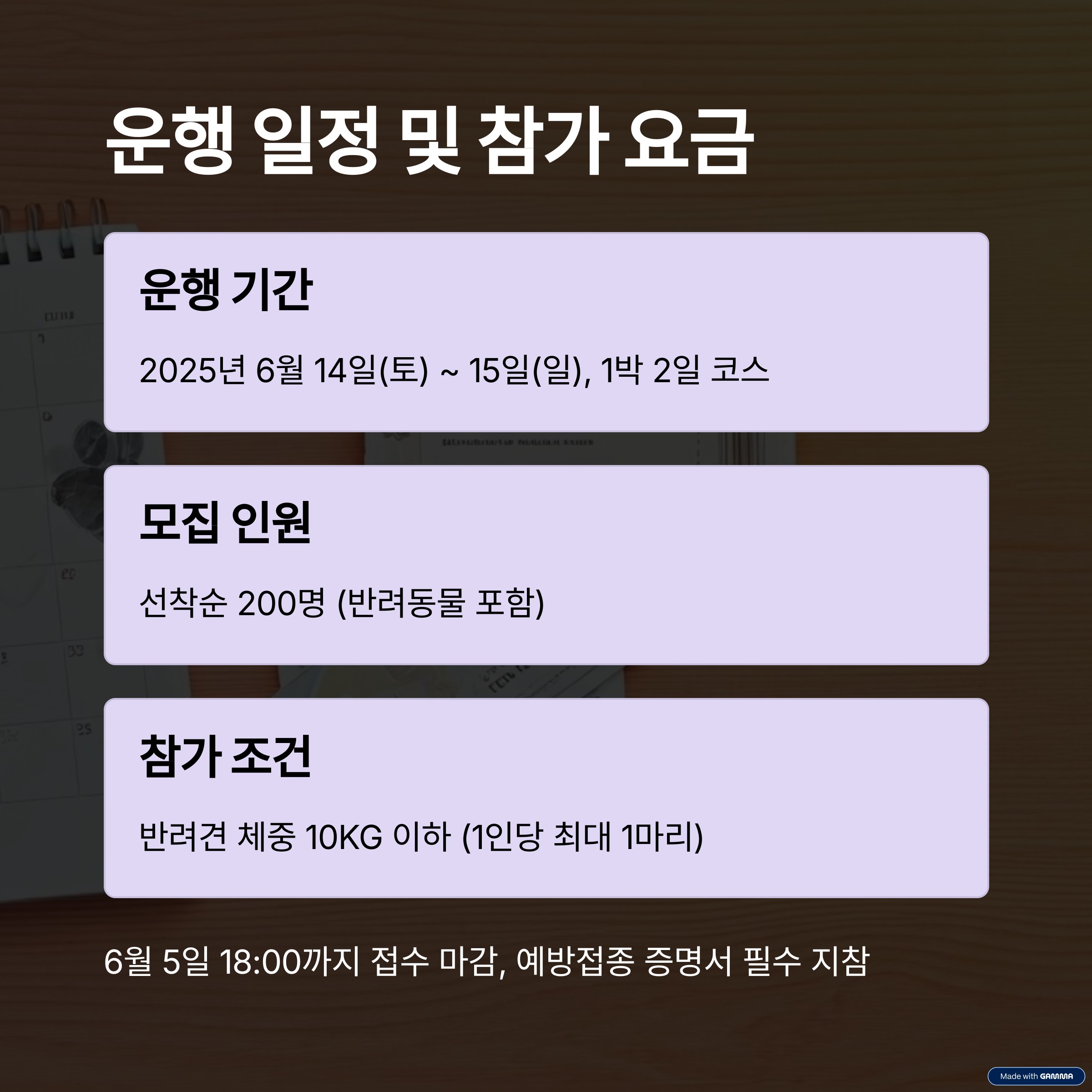 | 참가 요금 | 반려견 체중 10KG 이하 (코레일 공식 반려동물 운송 기준) |