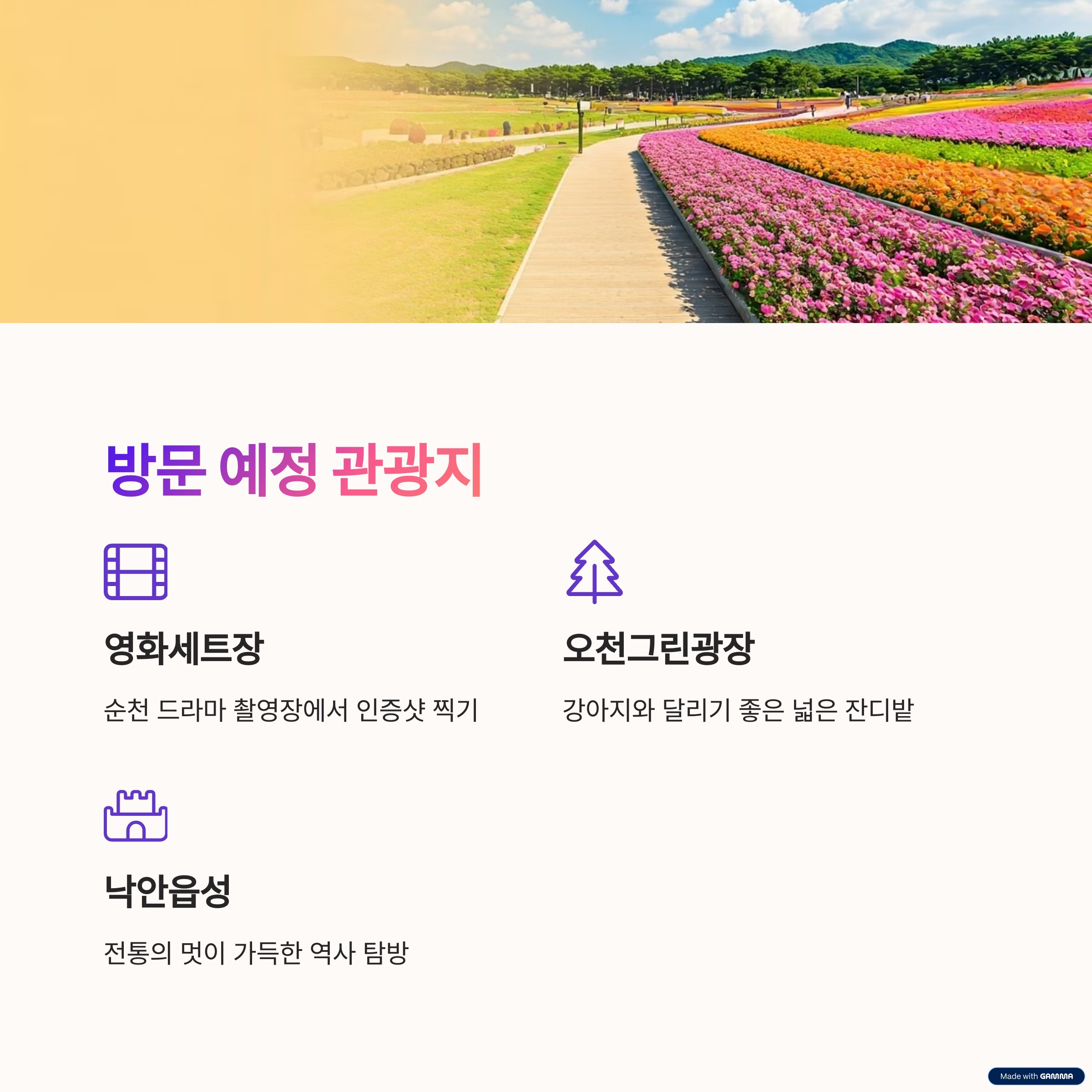 특히 이번 여행은 순천만국가정원 관람을 중심으로 진행되며, 반려동물과 함께 산책할 수 있는 구간이 별도로 마련되어 있습니다.