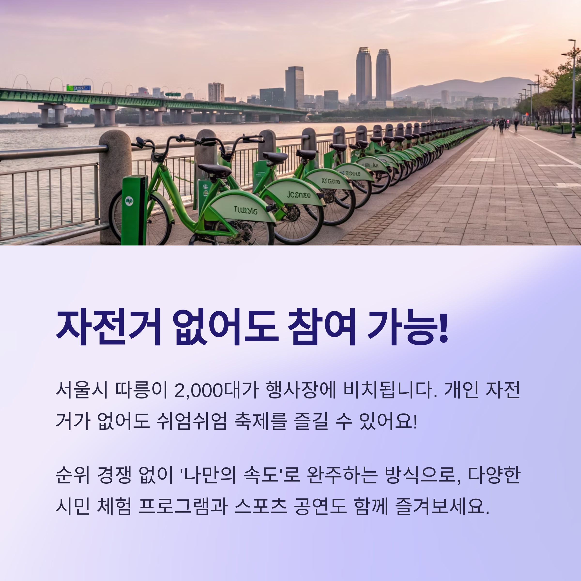 🚲 자전거: 서울시에서 제공하는 따릉이 2,000대가 행사장에 비치되어 있어 개인 자전거가 없어도 참여할 수 있습니다. 따릉이 이용은 참가비에 포함되어 있으며, 원하는 경우 개인 자전거 지참도 가능합니다.