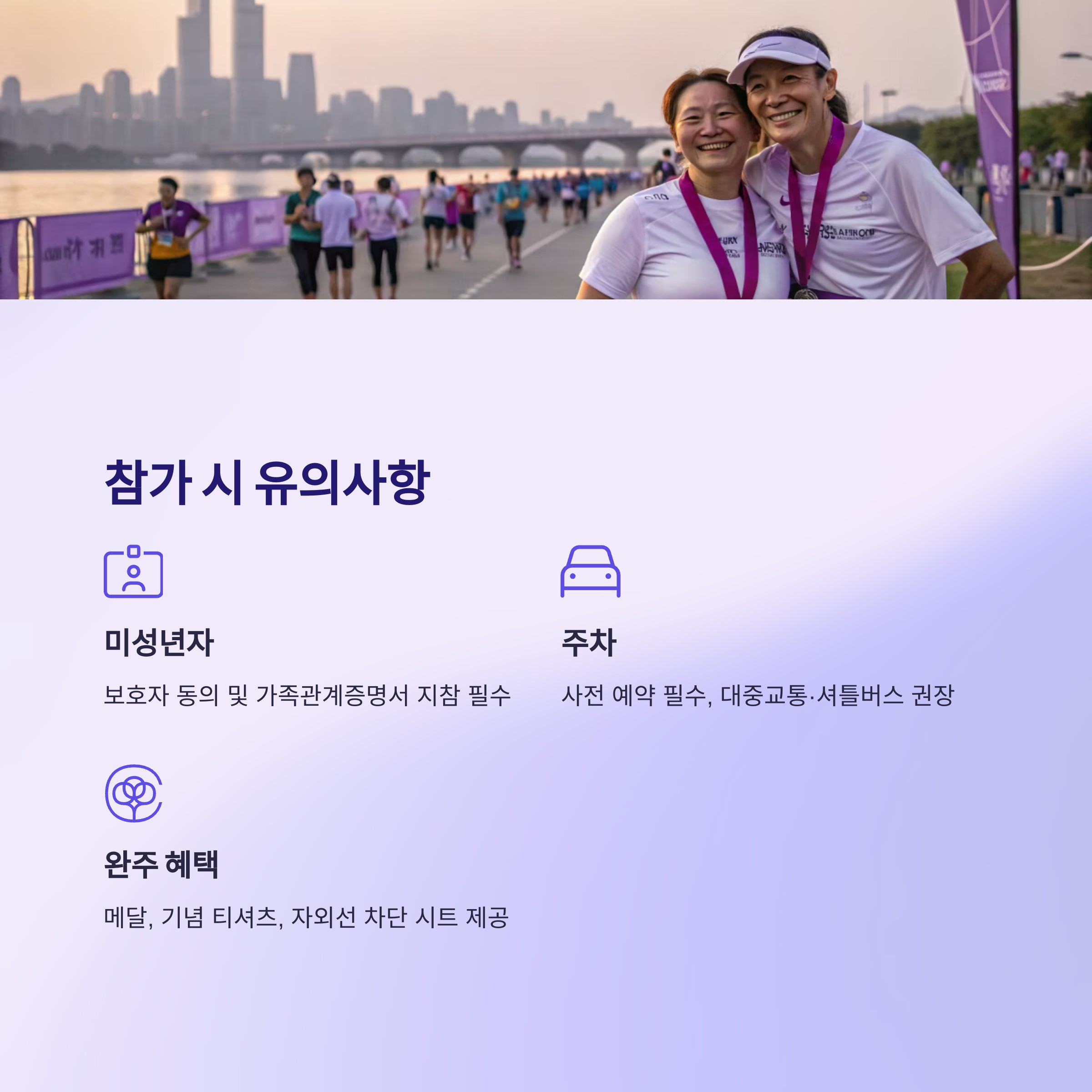 경쟁 없는 축제: 이 행사는 순위를 겨루는 대회가 아닌, 각자의 속도로 완주하는 것을 목표로 하는 축제입니다. 스포츠의 즐거움을 느끼며 한강의 아름다움을 만끽하세요!