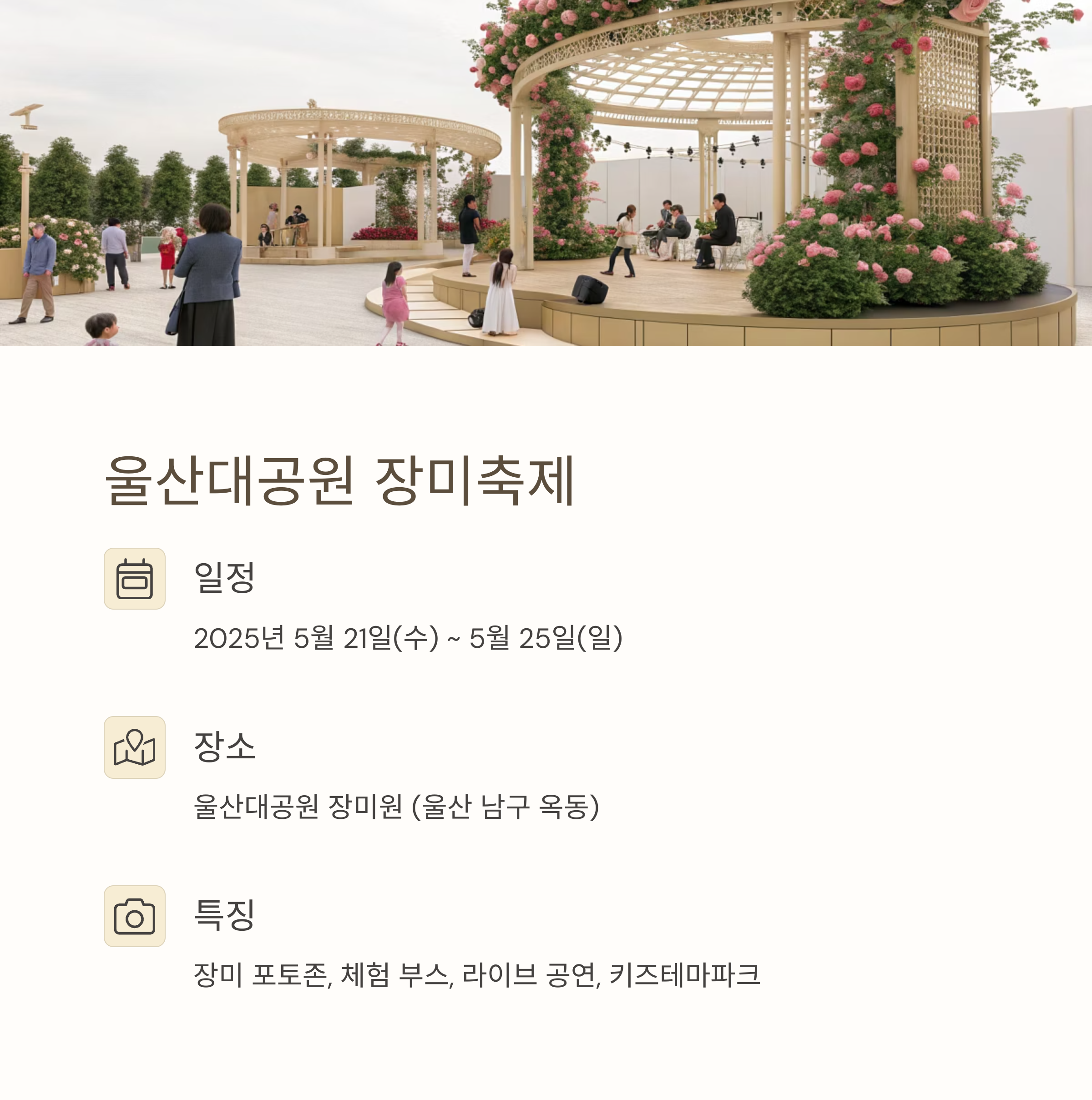 주요 프로그램: 장미터널 산책, 버스킹 공연, 장미 사진전, 플리마켓, 장미 테마 푸드존