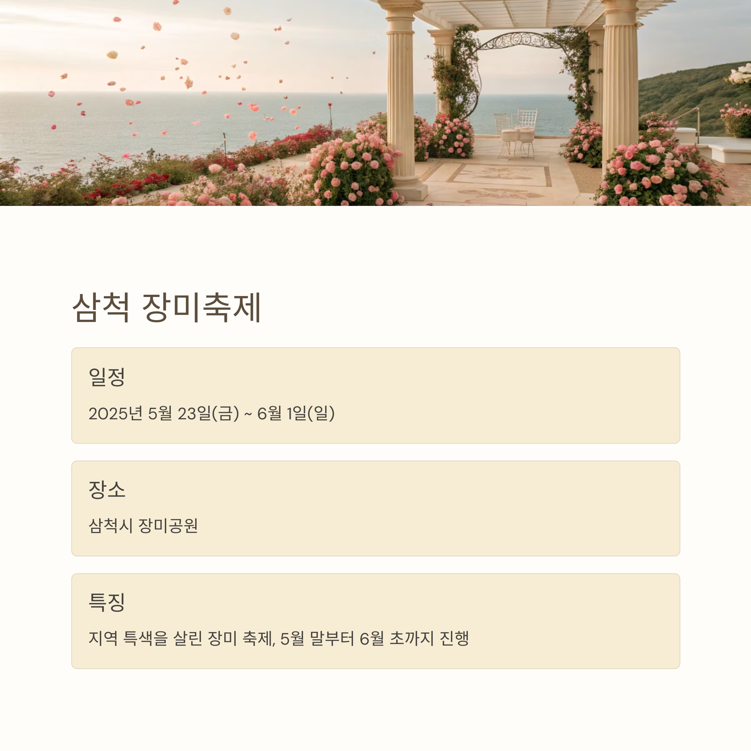 주요 프로그램: 바다 전망 장미길 산책, 해양 문화 공연, 장미 관련 체험 프로그램, 삼척 특산품 마켓
