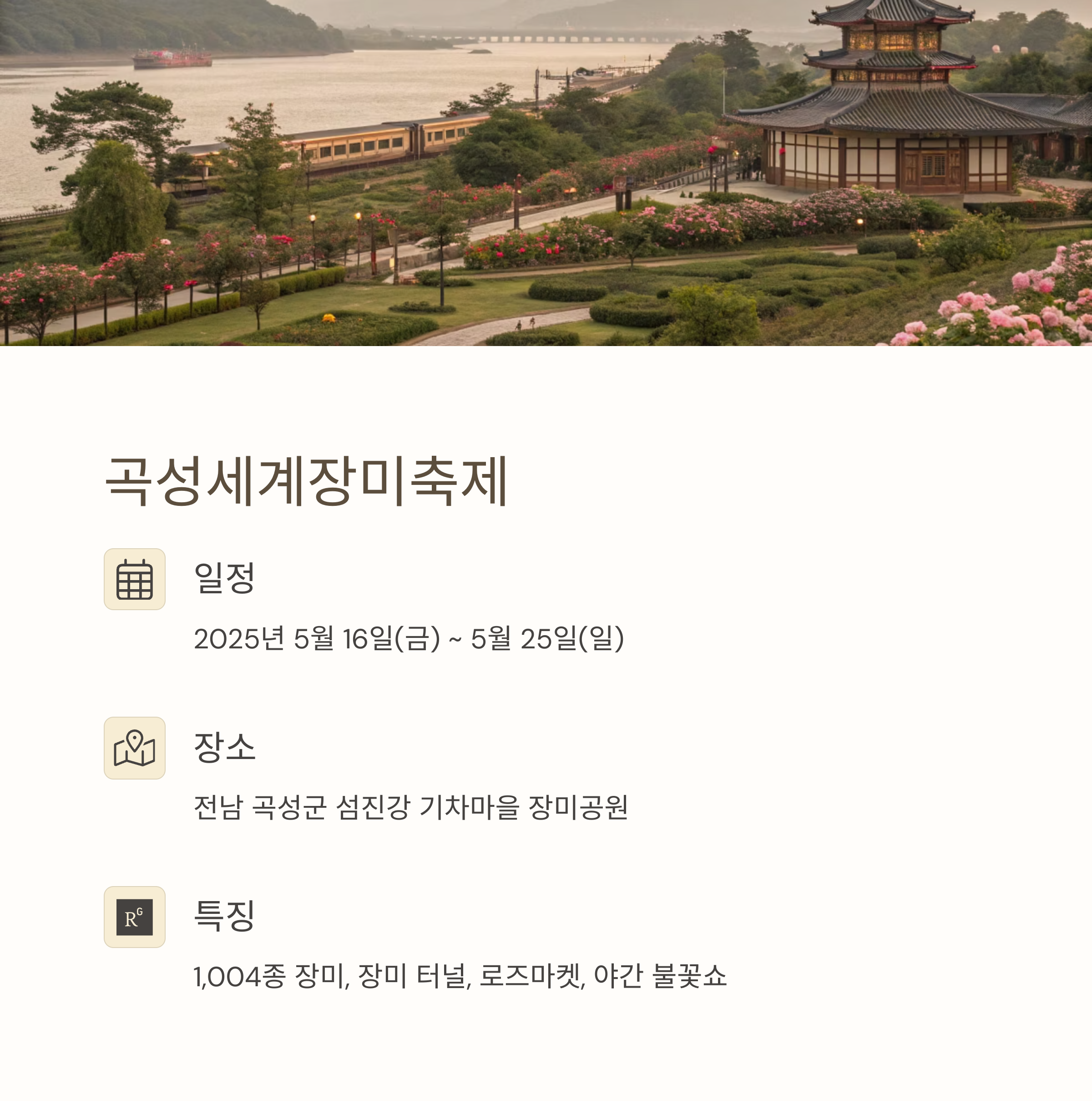 주요 프로그램: 1004종 장미, 장미정원 투어, 로즈 마켓, 장미차 시음회, 장미체험 프로그램, 곡성 로컬 푸드 마켓
