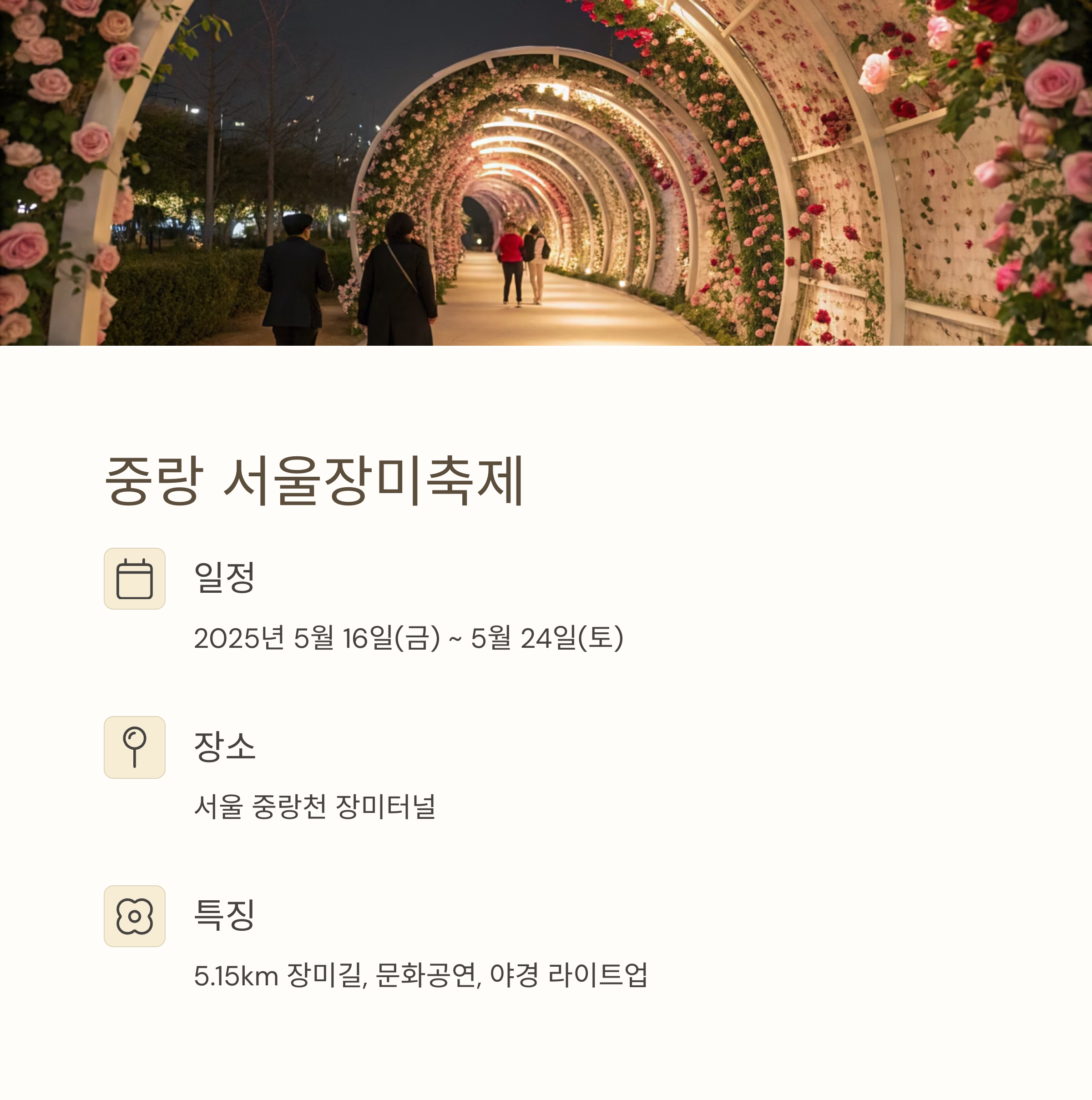 서울 중랑구 | 200여 종, 10만 송이 | 도심 속 1.5km 장미터널 | 도심에서 가까운 축제를 원하는 서울 시민 |