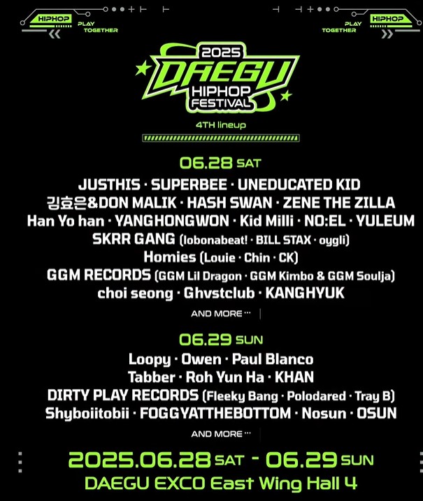 국내외 유명 힙합 아티스트와 신예 래퍼들이 대거 참여하는 대형 힙합 축제입니다. K-힙합의 메카인 대구에서 펼쳐지는 이 축제는 기존 스타들뿐만 아니라 떠오르는 신예 래퍼들의 무대도 함께할 예정입니다. 힙합 음악의 진정한 매력을 느낄 수 있는 국내 최대 규모의 힙합 전문 페스티벌입니다. 올해는 저스디스, 수퍼비, 언에듀케이티드 키드, 김효은&던말릭, 해쉬스완, 제네더질라, 한요한, 양홍원, 키드밀리, 노엘, 율음, 스꺼러갱, 호마들, 쥐쥐엠 레코즈, 최성, 고스트클럽 등