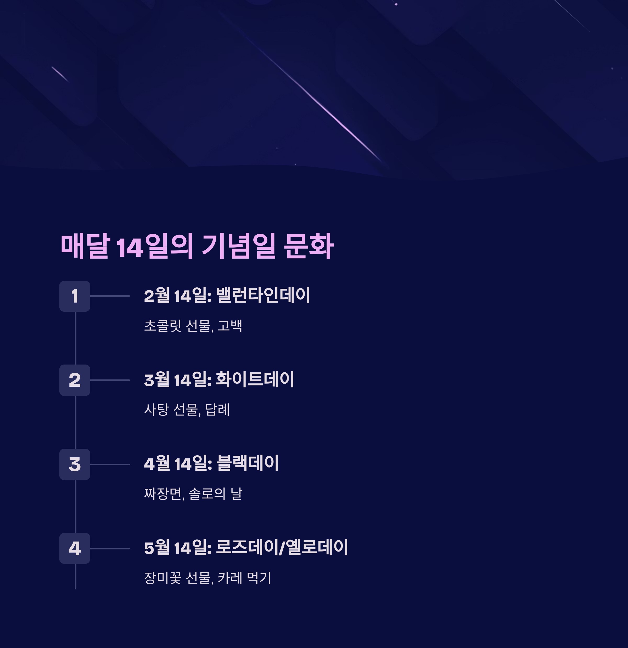 대한민국에는 매달 14일마다 다양한 기념일이 있습니다. 이러한 '데이 문화'는 주로 젊은 층 사이에서 인기를 끌며, 선물이나 이벤트를 통해 일상에 소소한 재미와 추억을 더하는 역할을 하고 있습니다.